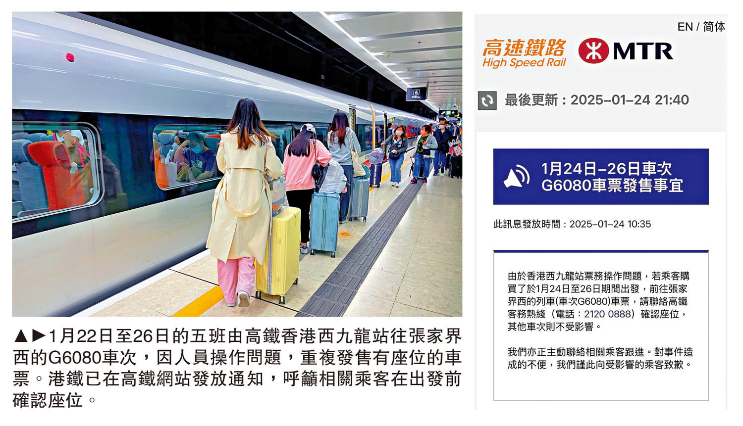 【大公報訊】記者伍軒沛報道:高鐵香港西九龍站往張家界西列車G6080,因人員操作問題,錯誤在票務系統中釋放出預留給已購票乘客的車票,致令有座位的車票重複發售。由1月22日至26日期間,共有5班由西九龍站出發前往張家界西的G6080車次受影響,涉及650名香港段及內地段的乘客,當中約70名為於西九龍站出發的乘客。高鐵為旅客帶來不便致歉,並呼籲相關乘客在出發前確認座位。有立法會議員對事件感到離奇,並認為情況並不理想。高鐵表示已即時加強相關程序,避免同類事件再發生,亦會與受影響乘客跟進後續安排。