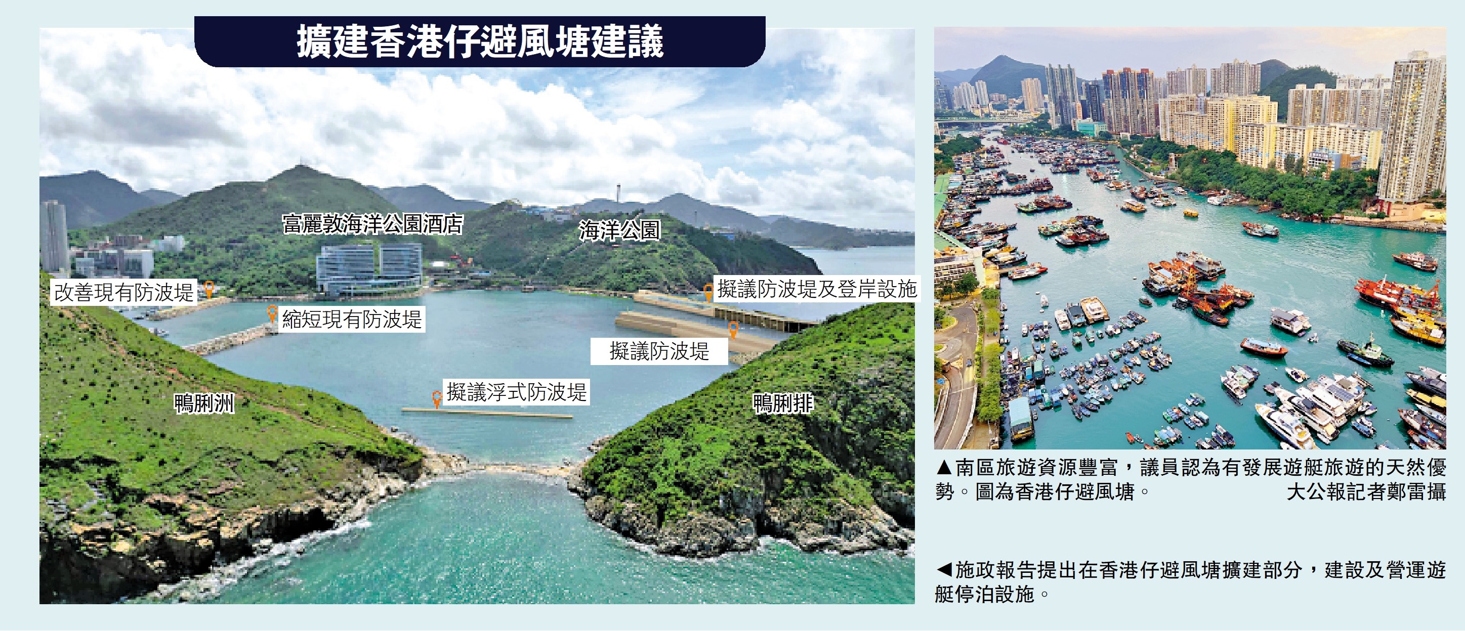 施政報告提出推動遊艇旅遊,計劃在香港仔避風塘擴建部分等三個地點,建設及營運遊艇停泊設施。發展局昨日邀請市場在三個月內,就於香港仔避風塘擴建部分發展遊艇停泊設施提交意向書,並計劃明年尋求立法會撥款,目標於2027年完成所須法定程序。