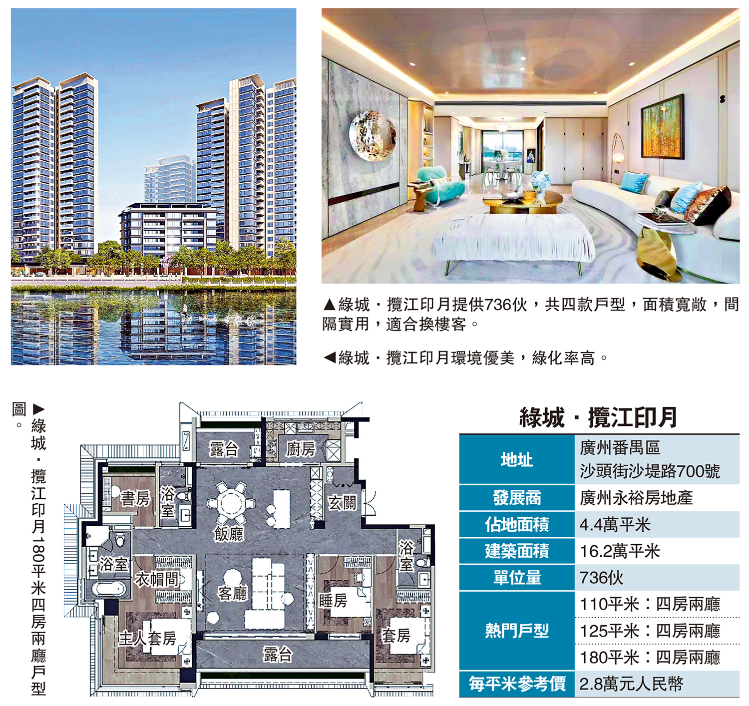 項目在售四款戶型,110平米單位為直廳設計,一整面為窗台,採光、通風良好,空間利用率高,能滿足三口之家和二孩家庭的需求;125平米戶型,在110平米基礎上面積放大,主人套房採光更充足;143平米戶型擁南北對流的雙露台,採光通風俱佳,可享受清爽的穿堂風,主人套房面積達30平米,幾乎與客廳同大,且通常為東南朝向,面向江景;180平米戶型專梯入戶,玄關有位置做儲物櫃,睡房以客廳為中心分布兩側,方便長者與年輕家庭成員各自擁有獨立的私密空間,客廳面積約50平米,觀景露台進深約2米,寬約8.5米,盡享江景和周邊美景。