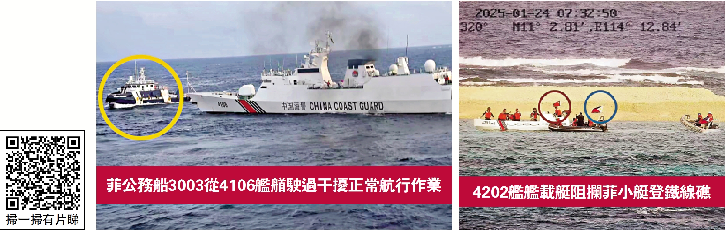 【大公報訊】記者郭瀚林、凱雷北京報道:1月24日,菲律賓3003號和3004號船未經中國政府允許,侵闖中國南沙群島鐵線礁附近海域,企圖非法登礁,中國海警船依法對菲船攔阻管制、警告驅離。26日,中方發布相關現場視頻、照片。