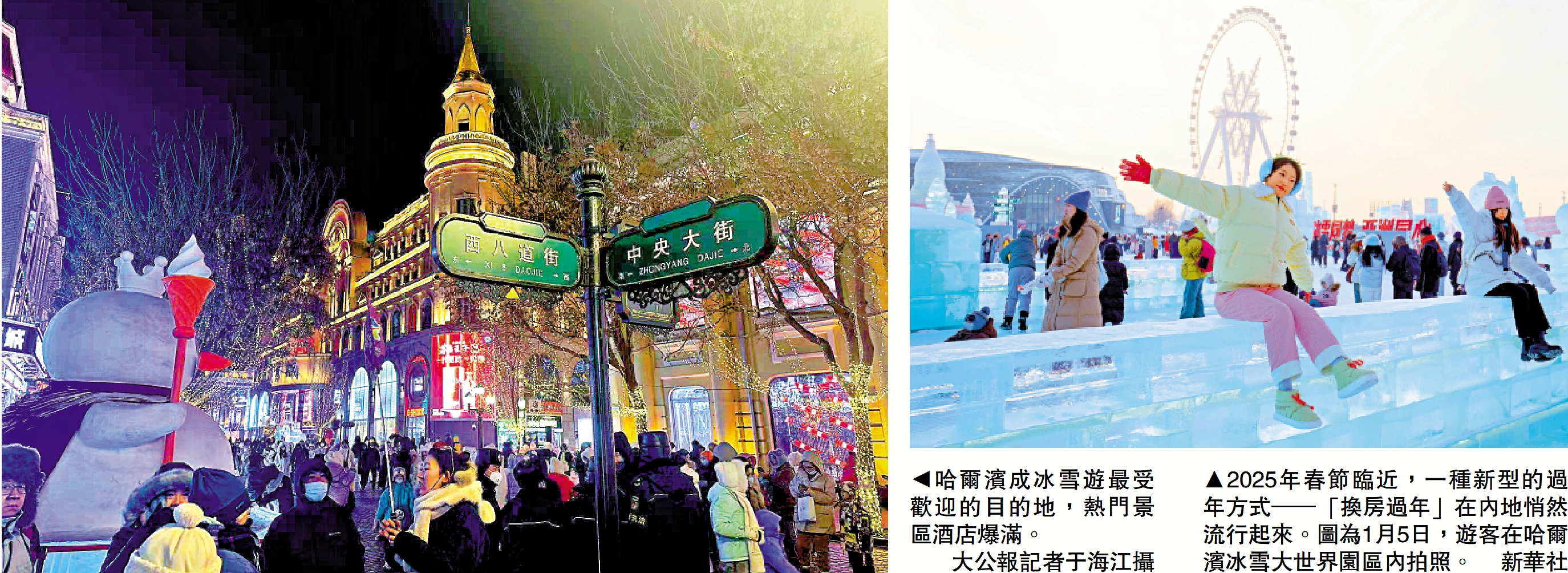 大公報記者連日來走訪哈爾濱冰雪大世界、中央大街、中華巴洛克等當地熱門景區周邊了解到,2025年春節期間酒店的房價從大年初一開始普遍上漲,標準雙床間平均價格在1000元(人民幣,下同)左右,五星級酒店要在2000元以上,甚至有些優勢地點的酒店房間已接近3000元一天。