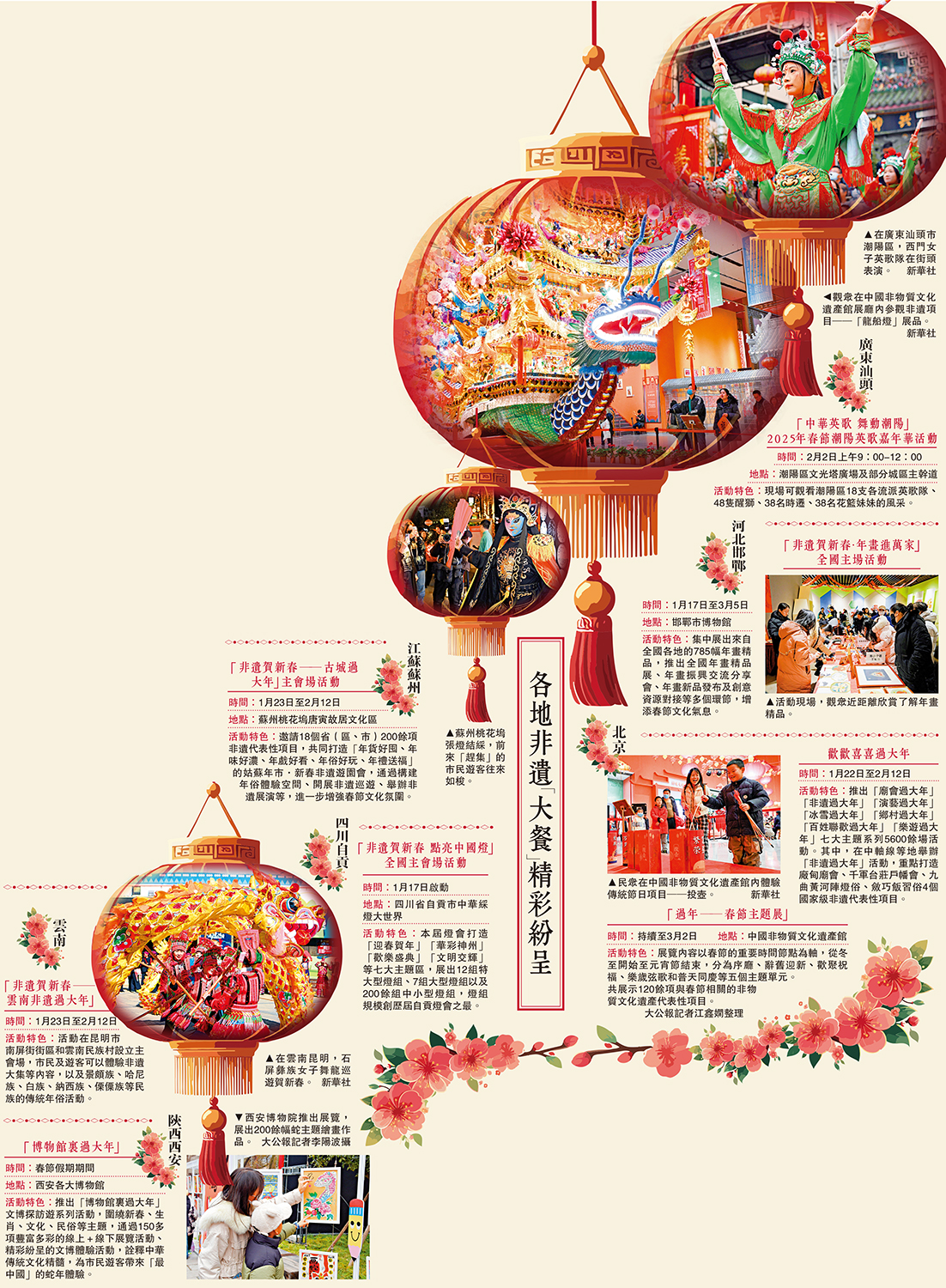 敲年鼓、印春貼、舞龍獅……首個「非遺版」春節臨近,各地紛紛端出豐盛的「非遺大餐」。文化和旅遊部非物質文化遺產司副司長胡雁介紹,此前,文旅部推動全國策劃開展近7000項非遺傳承實踐和傳播展示活動,重點推進10項「非遺賀新春」系列活動,讓遊客暢享首個「非遺版」春節。據了解,圍繞非遺保護傳承,將先後舉辦「古城過大年」、「點亮中國燈」蛇年燈會燈綵展示、「趕個年味集」蛇年非遺大集、「年畫進萬家」、「文脈頌中華」春節非遺宣傳推廣等民俗文化活動,河北、江蘇、四川等地將舉辦一系列主會場活動。\大公報記者 江鑫嫻