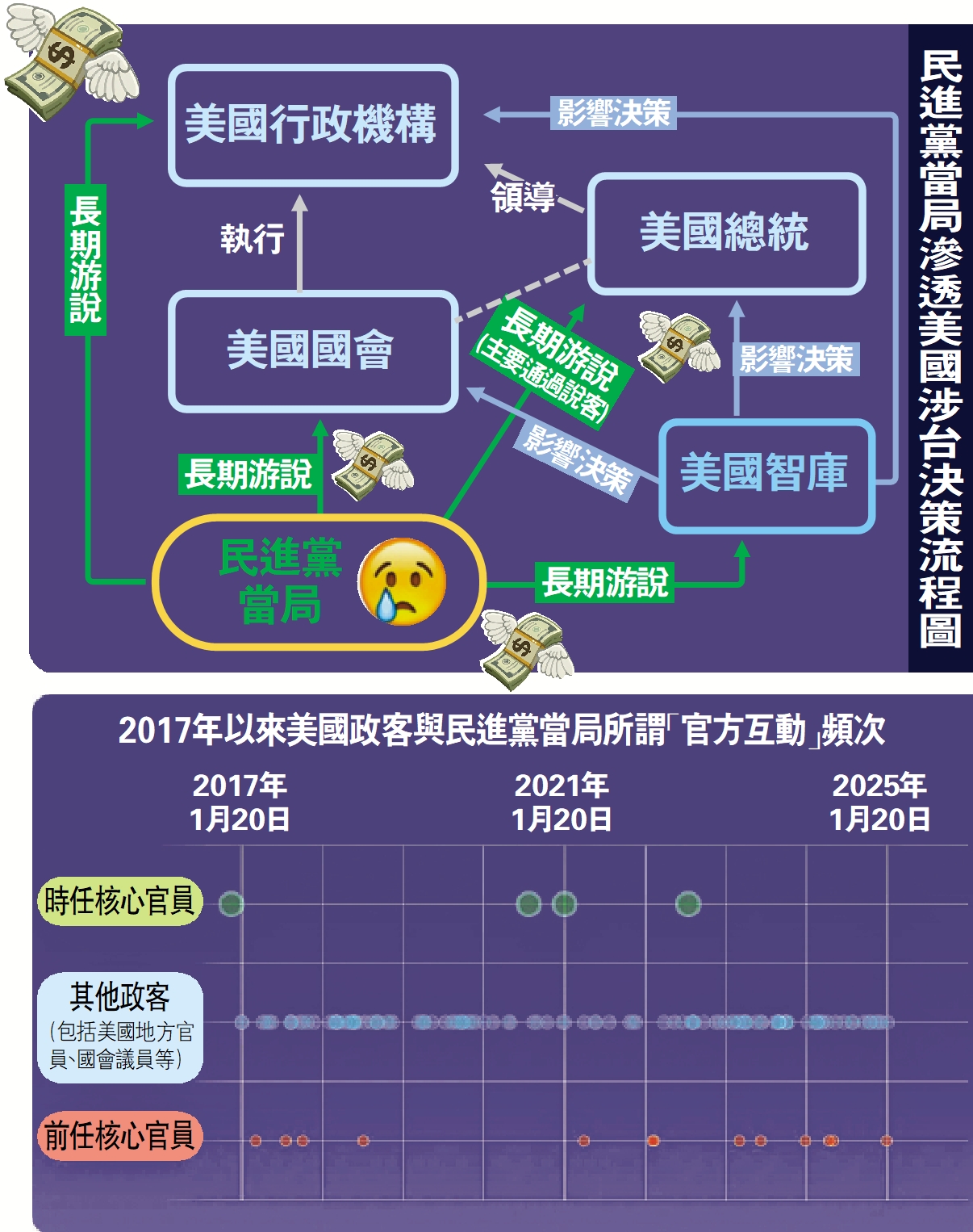 針對民進黨當局與美國涉台決策主體的互動關係,南京大學國際關係學院副教授周文星表示,台灣主要通過游說的方式,影響美國涉台政策的關鍵決策人。其中,美國國會議員管涉台立法,這會動搖美國涉台政策的根基,美國行政機構官員管即時的、當下的具體政策。台灣的游說是長期的、制度性的,而特朗普恰恰是一個喜歡打破制度的人,這給台灣的長期游說帶來了變量。
