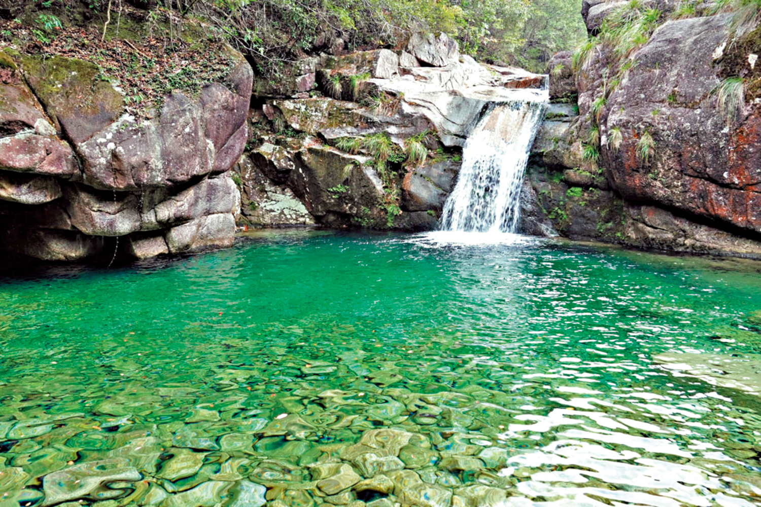 瀑,無澎湃水勢;潭,無千呎之深;溪,無激湍之流;石,無嶙峋之態,都給溪水打磨得光滑圓潤,唯巨石方而平,正好供遊人三五立石顧盼,舉相機留影。瀑以雄奇壯觀為美,此潭卻輕靈恬靜,陰柔秀美如歐陽修的古文。水聲清越,泠泠作響,山谷幽逸,仙女宛在。