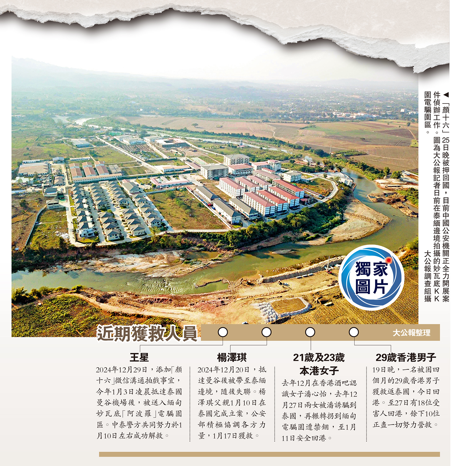 圖:「顏十六」25日晚被押回國,目前中國公安機關正全力開展案件偵辦工作。圖為大公報記者日前在泰緬邊境拍攝的妙瓦底KK園電騙園區。 大公報調查組攝