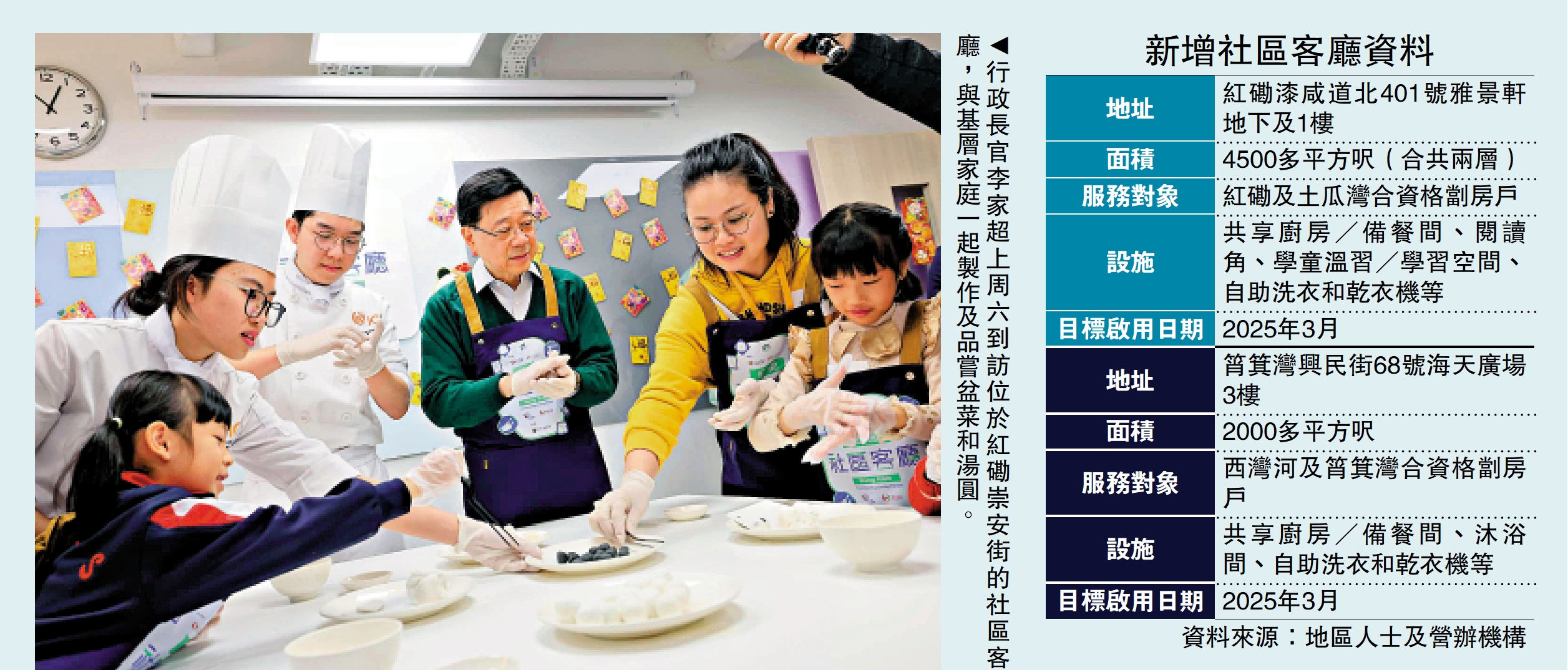 行政長官李家超於上周六(25日),到訪位於紅磡崇安街的社區客廳,和基層家庭一起製作和品嘗盆菜和湯圓。有社區客廳用戶表示,在社區客廳可以與街坊閒談、煮食及洗衣服,形容「好似一個大家庭,很開心!」
