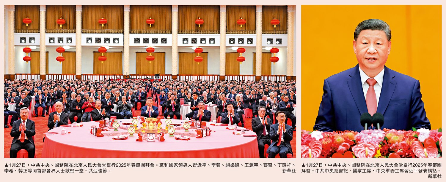 中共中央、國務院27日上午在人民大會堂舉行2025年春節團拜會。中共中央總書記、國家主席、中央軍委主席習近平發表講話,代表黨中央和國務院,向全國各族人民,向香港特別行政區同胞、澳門特別行政區同胞、台灣同胞和海外僑胞拜年。祝大家蛇年吉祥!習近平指出,在中華文化裏,蛇是靈性、智慧和生命力的象徵,寓意着豐收、吉祥和福瑞。乙巳蛇年,希望全國各族人民以蛇行千里的勁頭,堅定信心、滿懷希望,開拓進取、頑強奮鬥,共同書寫中國式現代化新篇章。