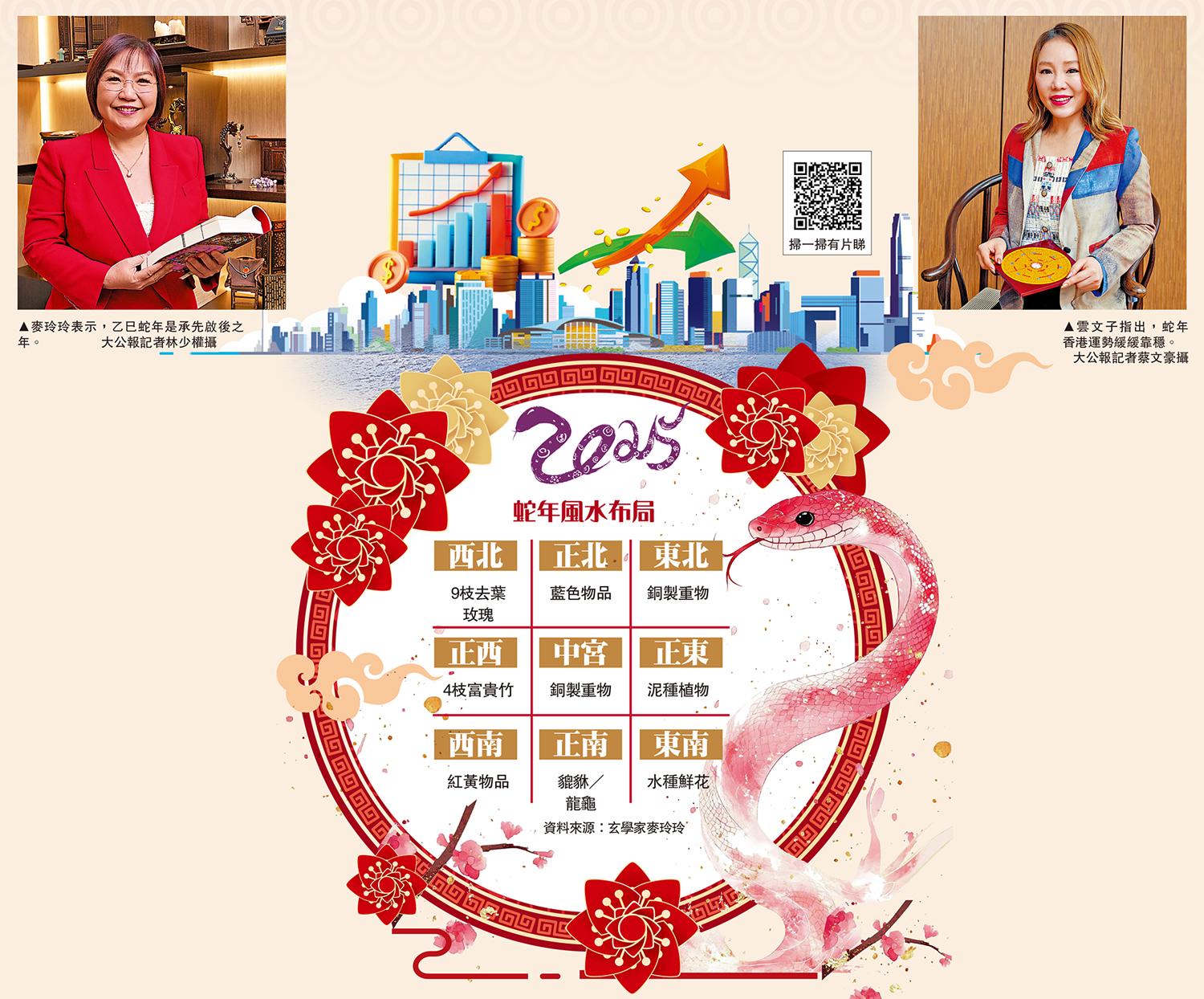 隨着風起雲湧的甲辰龍年即將結束,輪到乙巳蛇年伊始。玄學家麥玲玲指出,乙巳蛇年完全不見財星透出,危機四伏,導火線一觸即發,經濟表現受壓,金融股票市場難言興旺,惟物流、航空等屬水、木行業佔優。奇門遁甲嫡傳人雲文子指出,整體氣象較甲辰龍年樂觀,內地放寬旅遊措施帶動香港旅遊業發展。\大公報記者 李潔儀