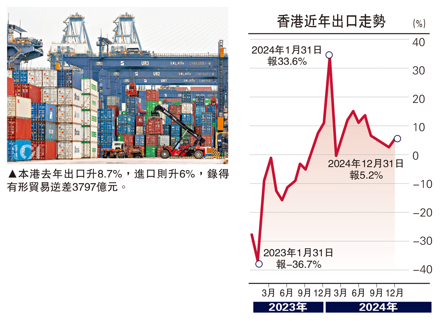 【大公報訊】政府統計處昨公布,上月本港整體出口貨值按年上升5.2%,升幅優於市場預測,並連升10個月,惟進口表現由升轉跌。2024全年合計,商品整體出口貨值按年上升8.7%,商品進口貨值上升6%,錄得有形貿易逆差3797億元,相等於商品進口貨值的7.7%。