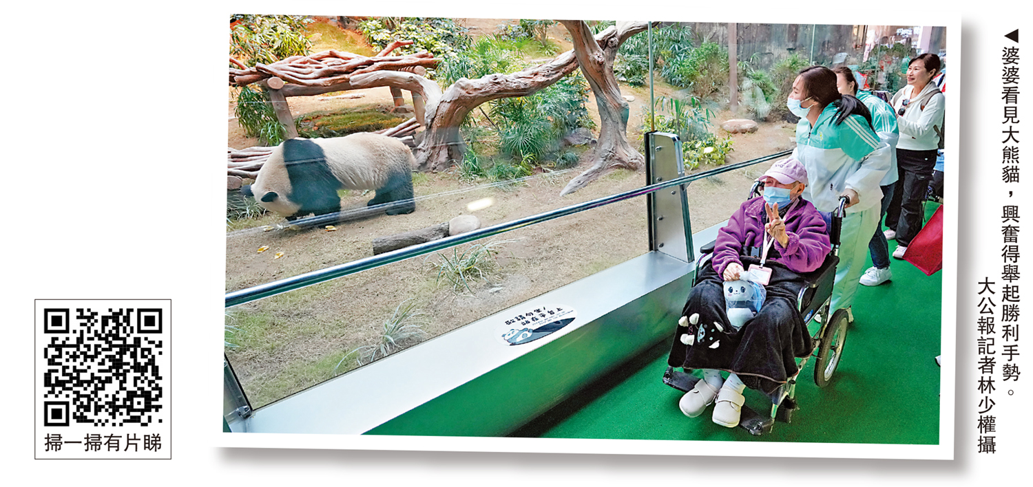 「聽護工講,今天媽媽特意選出一件色彩鮮艷的紫色衫,問她知不知道要去哪裏,也能大聲回答『海洋公園』,可見她特別期待。」曾小姐說,媽媽郭佩蓮去年底剛過92歲生日,因患有心臟衰竭,現時居於院舍並接受晚期護理,這次是母女倆相隔逾20年再次一起到海洋公園,也是媽媽第一次看真的大熊貓,故十分興奮。
