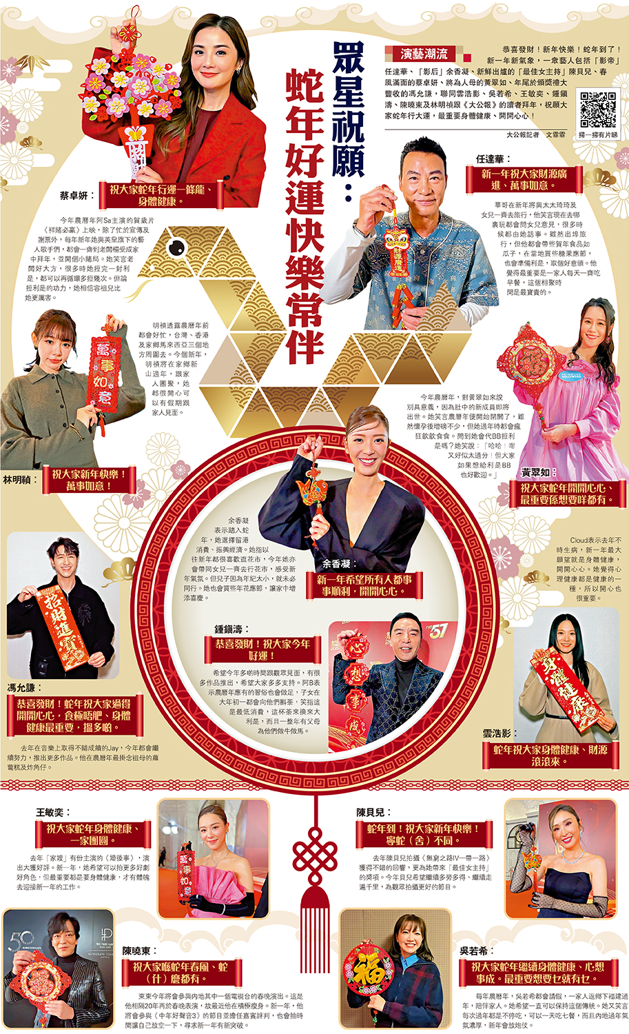 恭喜發財!新年快樂!蛇年到了!新一年新氣象,一眾藝人包括「影帝」任達華、「影后」余香凝、新鮮出爐的「最佳女主持」陳貝兒、春風滿面的蔡卓妍、將為人母的黃翠如、年尾於頒獎禮大豐收的馮允謙,聯同雲浩影、吳若希、王敏奕、鍾鎮濤、陳曉東及林明禎跟《大公報》的讀者拜年,祝願大家蛇年行大運,最重要身體健康、開開心心!\大公報記者 文霏霏