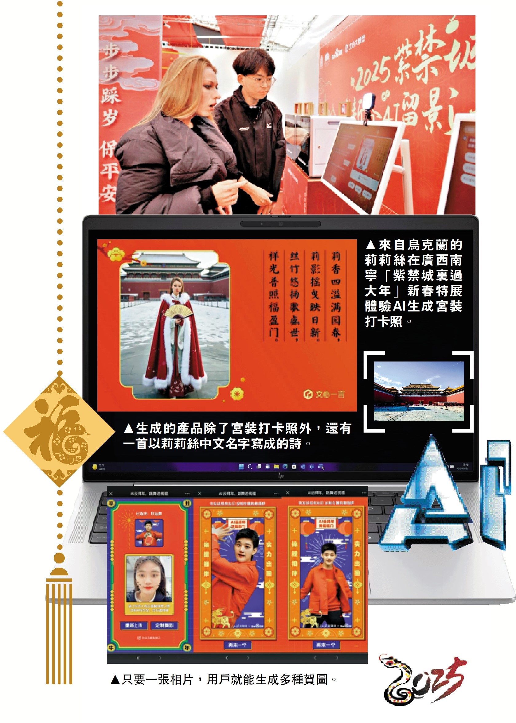 乙巳蛇年新春,一場由AI(人工智能)掀起的「數字年俗」在神州大地引發狂歡:線上AI智能變裝、「瞬移」世界,用戶只要上傳一張相片就能生成花樣賀圖、視頻,廣場舞大媽轉眼間就置身巴黎鐵塔下大秀《最炫民族風》;線下AI機器人上春晚扭秧歌,進駐各地新春文旅活動與遊人互動,為民眾帶來科技感滿滿的年味兒……各大科技企業紛紛推出創新應用,讓用戶解鎖「AI花式過年」新體驗。專家稱,今年堪稱是第一個AI全面參與普通人生活的春節。\大公報記者 王珏北京報道