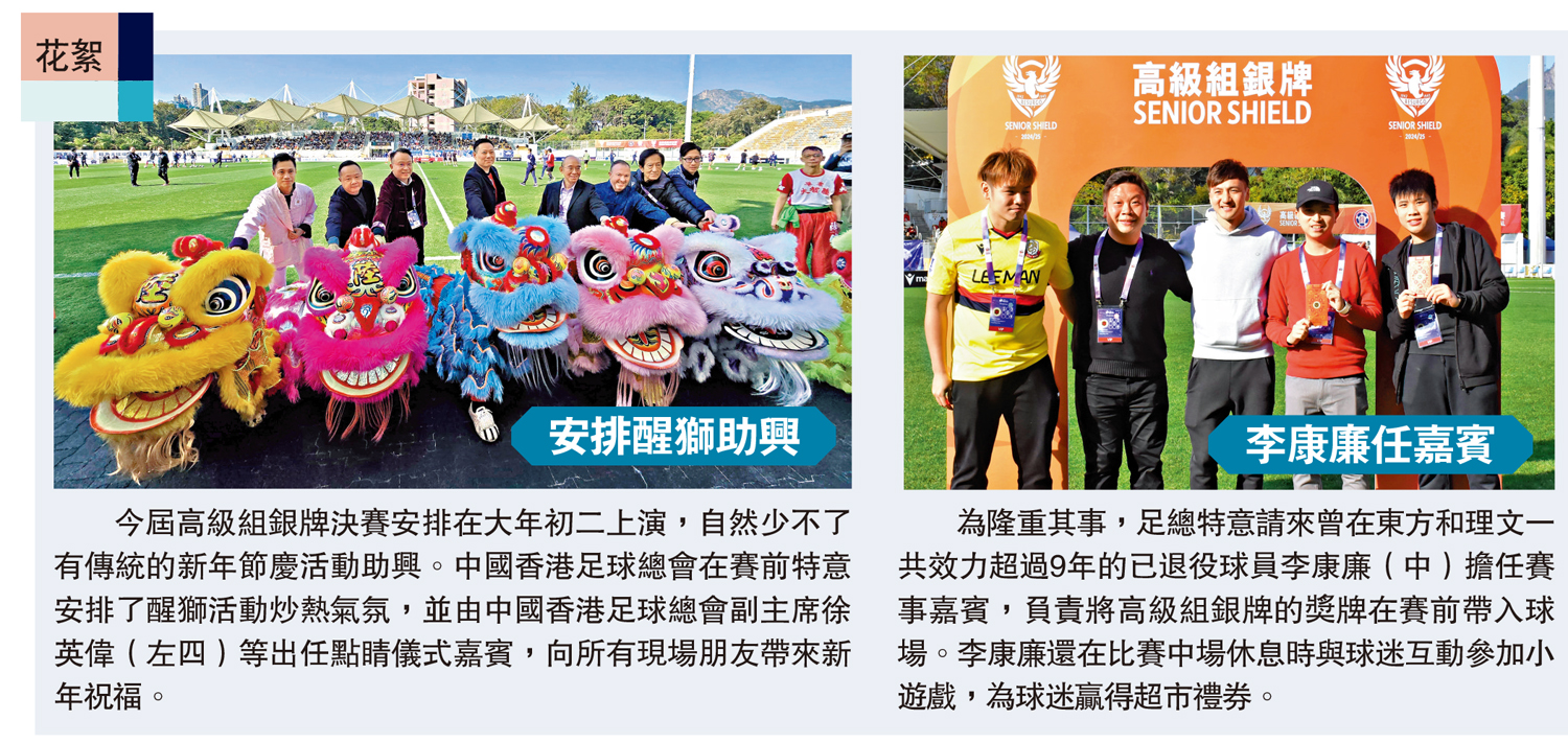 今屆高級組銀牌決賽安排在大年初二上演,自然少不了有傳統的新年節慶活動助興。中國香港足球總會在賽前特意安排了醒獅活動炒熱氣氛,並由中國香港足球總會副主席徐英偉(左四)等出任點睛儀式嘉賓,向所有現場朋友帶來新年祝福。