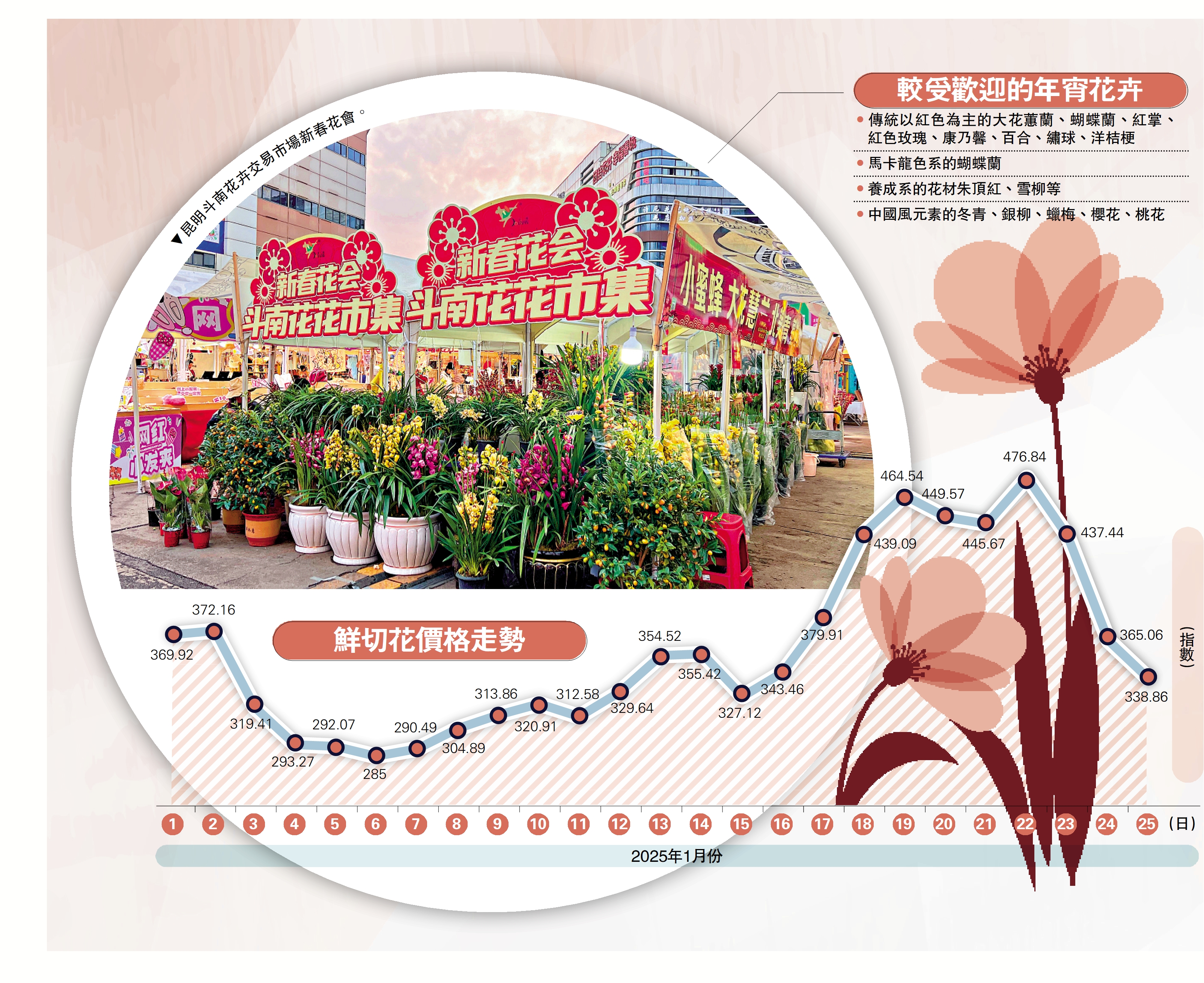 在中國主要鮮花產地雲南,從基地大棚到花卉市場,傳統年宵花熱度不減,迷你盆花也熱賣。今年花卉單價需略有下降,但基地憑藉鮮花數量和質量的提升仍創下銷售佳績。「銷售高峰期從去年年底就開始了,這些天還有客戶來要花,可是我們都已經賣完了,沒辦法再供貨了。」雲南樺蘭世家九溪基地負責人瞿亞娥說。瞿亞娥就估計,基地今年的銷售總收入會有500萬元(人民幣,下同)。各類花卉中,傳統的以紅色為主的大花蕙蘭、蝴蝶蘭、紅掌、紅色玫瑰、康乃馨、百合、繡球、洋桔梗都特別受追捧。/大公報記者 譚旻煦(文、圖)