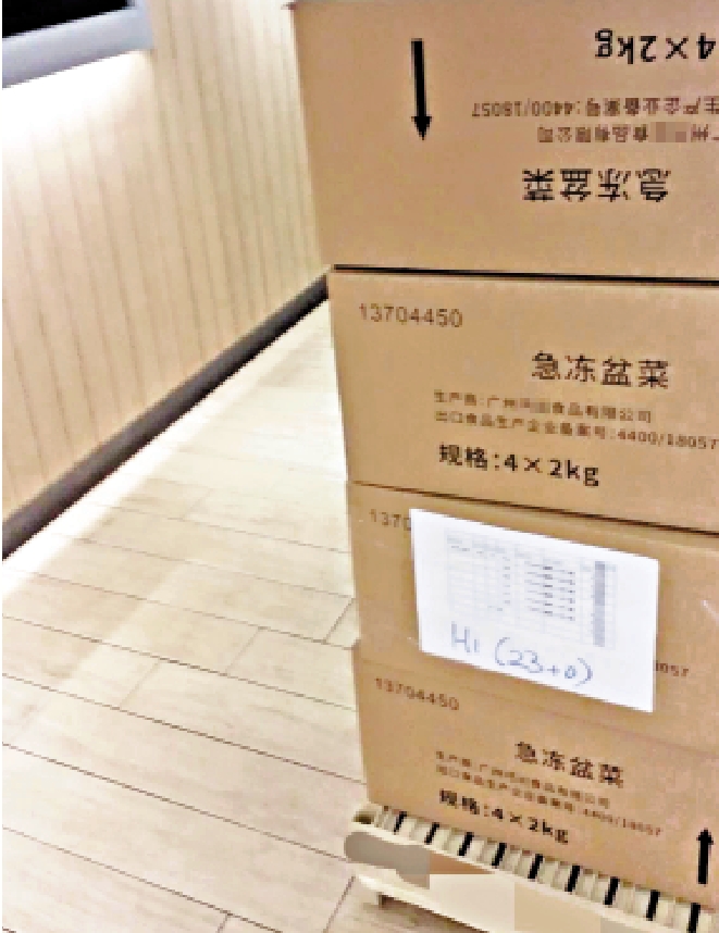 一名市民在社交網站群組發帖及上傳相片,顯示在一連鎖快餐店內,放有多個紙箱,上面以簡體中文寫明「急凍盆菜」,生產商為廣州一食品公司,發帖者驚嘆,「今日先至知原來……盆菜並非大埔工場做。」