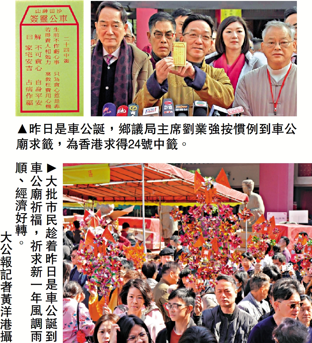 新界鄉議局主席劉業強昨日按照傳統習俗,到車公廟為香港祈福,並求得24號中籤。籤文內容為「生前不作虧心事,只為貪心惹是非,若得貴人相勉力,莫教枉費用心機」。劉業強向傳媒解釋籤文時指出,財政預算案在即,特區政府和社會各界也需要做實事帶動經濟。