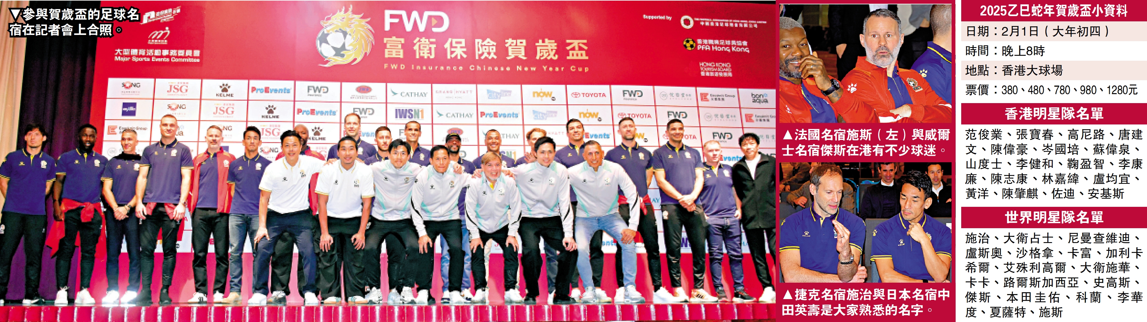 2025乙巳蛇年賀歲盃足球賽將於今天大年初四晚上8時在香港大球場舉行,球賽由眾多世界足壇名宿組成的世界明星隊迎戰由本地足壇名宿組成的香港明星隊。賽會昨早在灣仔一間酒店舉行記者會造勢,曾經被稱為世界球壇第三人的車路士名宿夏薩特首度訪港,他和前車路士舊隊友艾殊利高爾皆表示期待今晚與球迷一起享受比賽。司職中場的港足名宿黃洋則想對上巴西名宿卡卡,而作為前港足後防核心的陳偉豪則笑言想攔截西班牙傳奇中場大衛施華的腳下球。(ViuTV 99台明晚7時30分開始直播賽事)\大公報記者 張銳(文、圖)