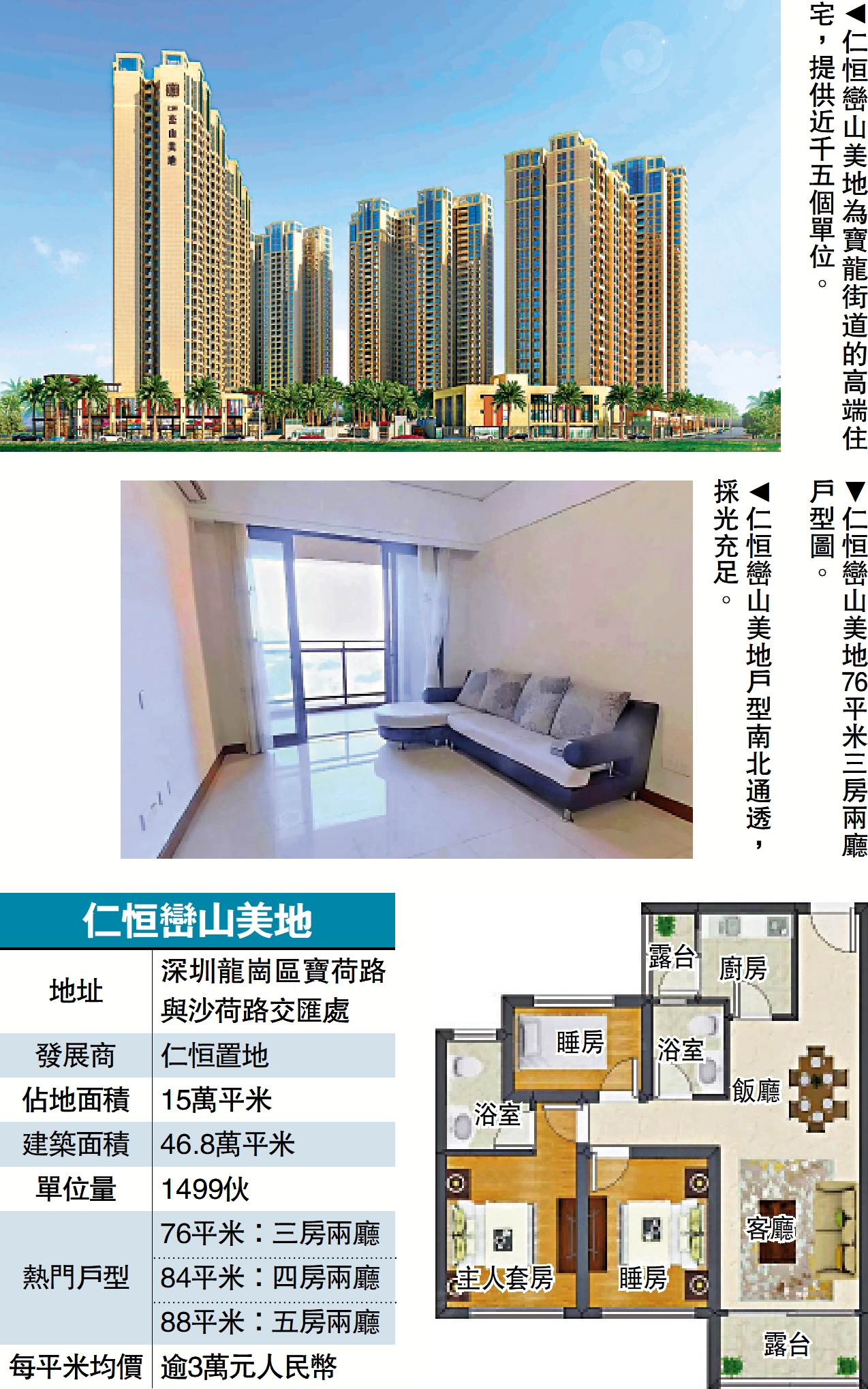 仁恒巒山美地作為深圳龍崗區寶龍街道的高端住宅,以完善的設施和便捷的交通,受到買家的青睞。項目佔地15萬平米,建築面積46.8萬平米,共提供1499伙。單位戶型方正、採光充足、南北通透,實用率高達90%。主力戶型涵蓋76平米三房、84平米四房、87至88平米五房等,滿足不同家庭規模的居住需求。市場每平米均價略高於3萬元人民幣。