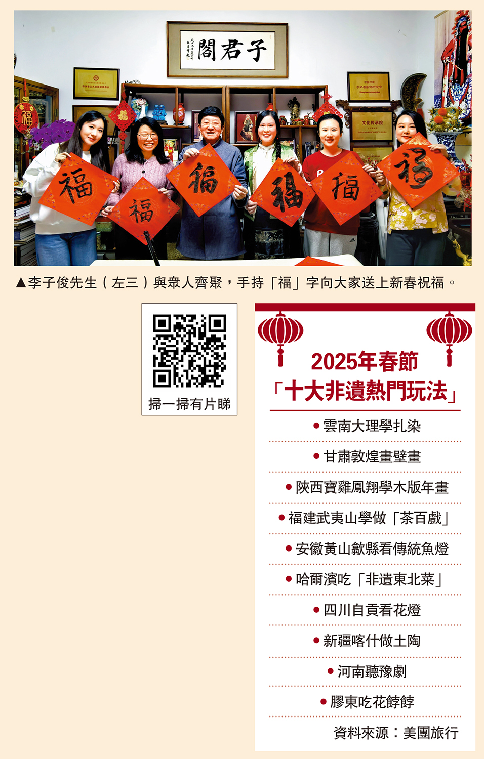 在北京李洪春故居文化傳承院裏,梨園弟子們演唱京劇、表演樂器,寫福字互相祝福,院中一片歡歌笑語;鳳凰嶺廟會上,抖空竹傳統技藝精彩登場,帶領人們重拾記憶中的年味;顏料會館裏,剪紙、掐絲琺瑯、竹編畫等眾多非遺技藝紛紛亮相,400多年的戲樓在新春之際煥發新光彩……而這每一處傳承都是非遺人對非遺文化深情致敬與生動演繹。2025年的蛇年春節,是成功申遺後的首個春節,從「傳統節日」到「文化遺產」,從「中國年」到「世界年」,非遺人們也以滿腔熱忱探索和實踐着非遺文化的傳承之道。\大公報記者 任芳頡、郭瀚林(文、圖)