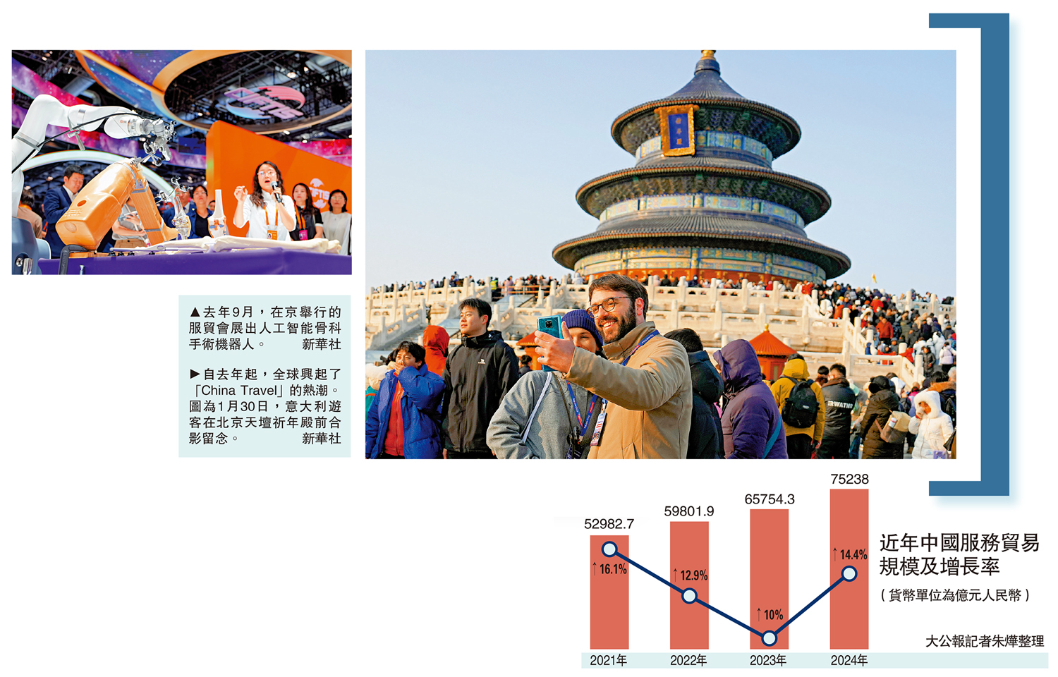 在去年起「China Travel」的全球熱潮帶動下,中國服務貿易展現出前所未有的活力與潛力。商務部最新數據顯示,2024年中國服務進出口總額75238億元人民幣,同比增長14.4%,首次突破1萬億美元大關,規模創下歷史新高,結構持續優化,展現出廣闊的發展潛力。此間專家認為,未來中國將繼續提升制度型開放水平,挖掘產業數字化潛力,深化國際合作,以開放創新為服務貿易高質量發展注入強勁新動能。\大公報記者 朱燁北京報道