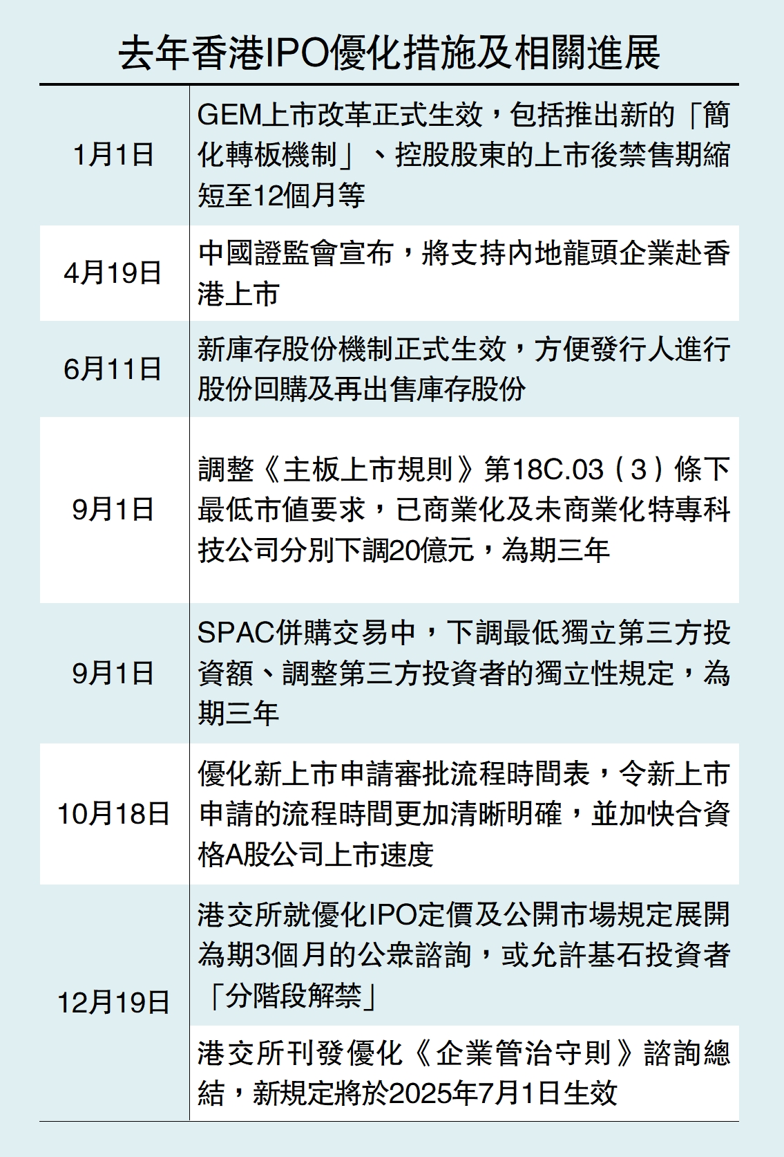 是次諮詢涉及9大主題,提出的建議包括:將公開認購的初始分配份額設定為5%,並採用回撥上限為最高20%的回補機制,而現行回補機制的回撥上限高達50%,換言之,國際配售部分至少保證佔80%;考慮允許基石投資者相關證券「分階段解禁」,其中50%在上市3個月後解禁,餘下部分在上市6個月後完全解禁。公眾諮詢期將在3月19日屆滿。