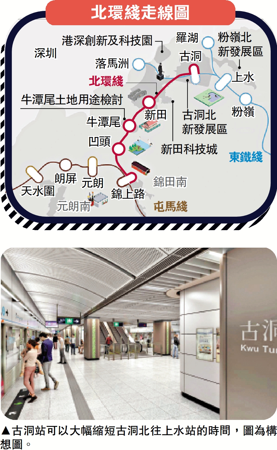 在現有東鐵綫落馬洲支線上增建古洞站,以及在現有屯馬綫錦上路站與古洞站之間興建一條約10.7公里長的主線,並於凹頭、牛潭尾和新田增設三個中途站。完成後的北環綫與現有的東鐵綫及屯馬綫,將形成一個貫通新界和九龍市區的環狀鐵路。