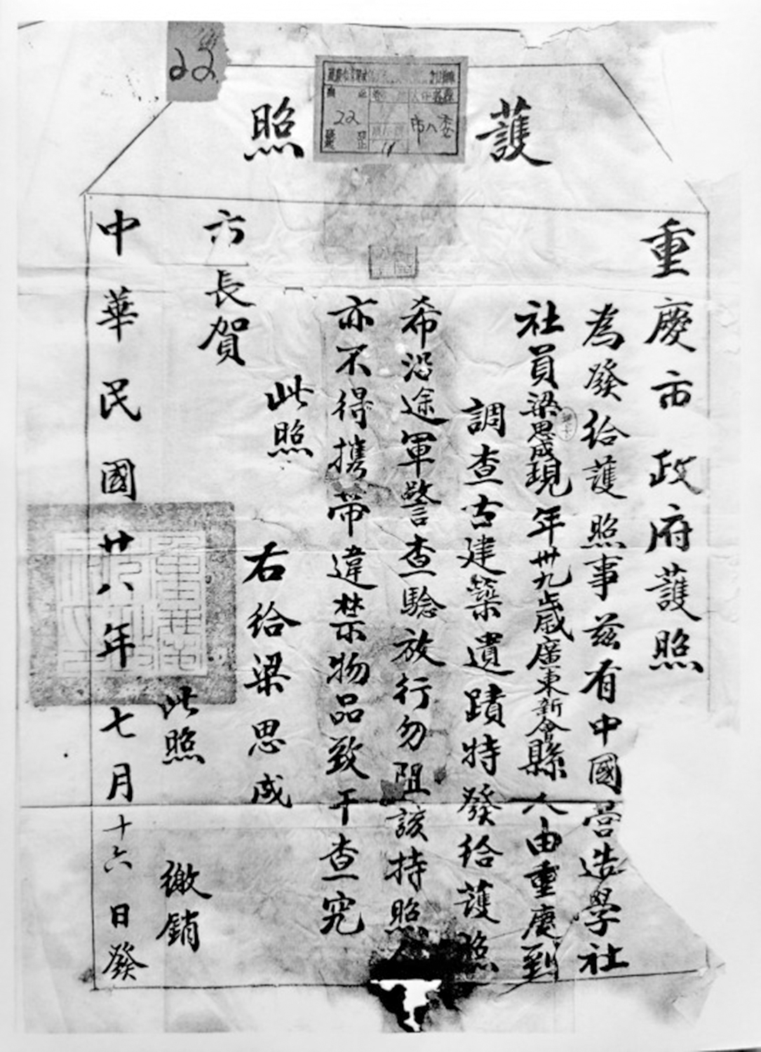 營造學社在重慶的第一天調查,就因空襲警報而戛然而止。日軍在重慶和成都的大轟炸,已使很多古建築嚴重損毀,這讓梁思成意識到,此次調查更像一場與日寇戰火的賽跑,考察得越多,記錄的標本也越多。對於這次調查的緣起,梁思成、劉敦楨均未有回憶,但這很可能是「一種在被動時局下的主動選擇」、一次在戰火中的行走和調查。抗日戰爭全面爆發,營造學社一直在炮火中輾轉內遷,不得已終止了華北地區的古建築調查,只能將考察重心從華北轉移到西南。