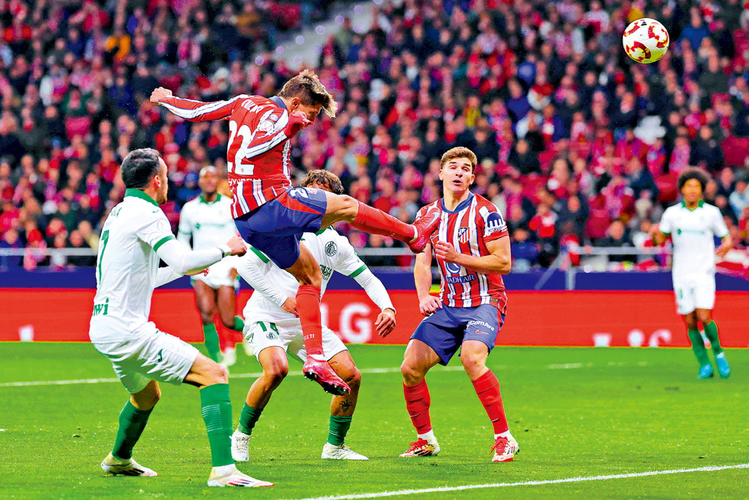 西班牙盃8強周四上演馬德里體育會主場對基達菲,主隊今仗出了近半隊阿根廷球員上陣,其中主帥施蒙尼兒子基利安奴施蒙尼(左二)於8及17分鐘建功,42分鐘森美爾連奴射成3:0完半場。下半場安祖哥利亞及阿歷山大索洛夫各入1球,馬體會以5:0大勝,這是馬體會自1965年後,於西班牙盃8強或以後的階段造出的最大勝仗。