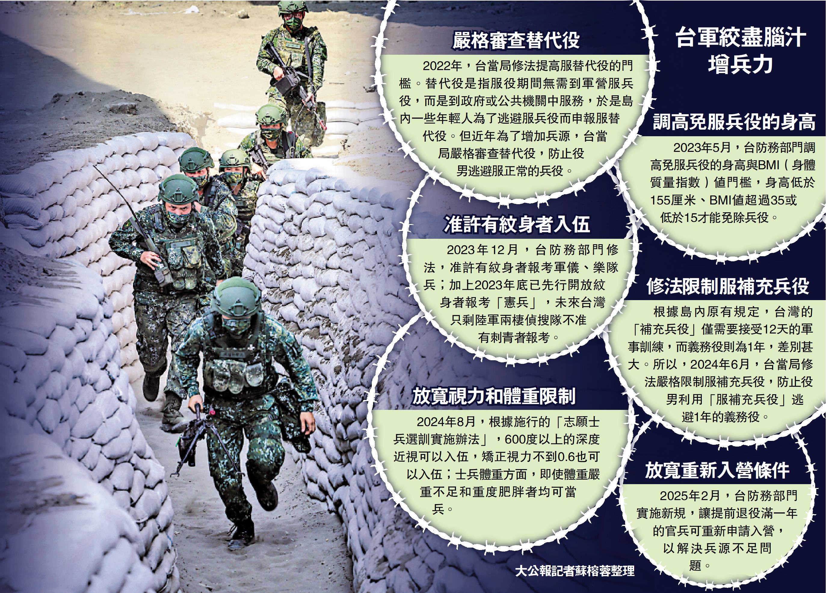 【大公報訊】據中通社、台媒報道:台軍人力近5年持續吃緊,尤其是基層軍官人員不足。當局2025年防務預算顯示,2025年減少的「預算員額」中,全部是基層部隊骨幹官兵,甚至選擇賠錢提前退伍的官兵過去4年增幅達4倍。