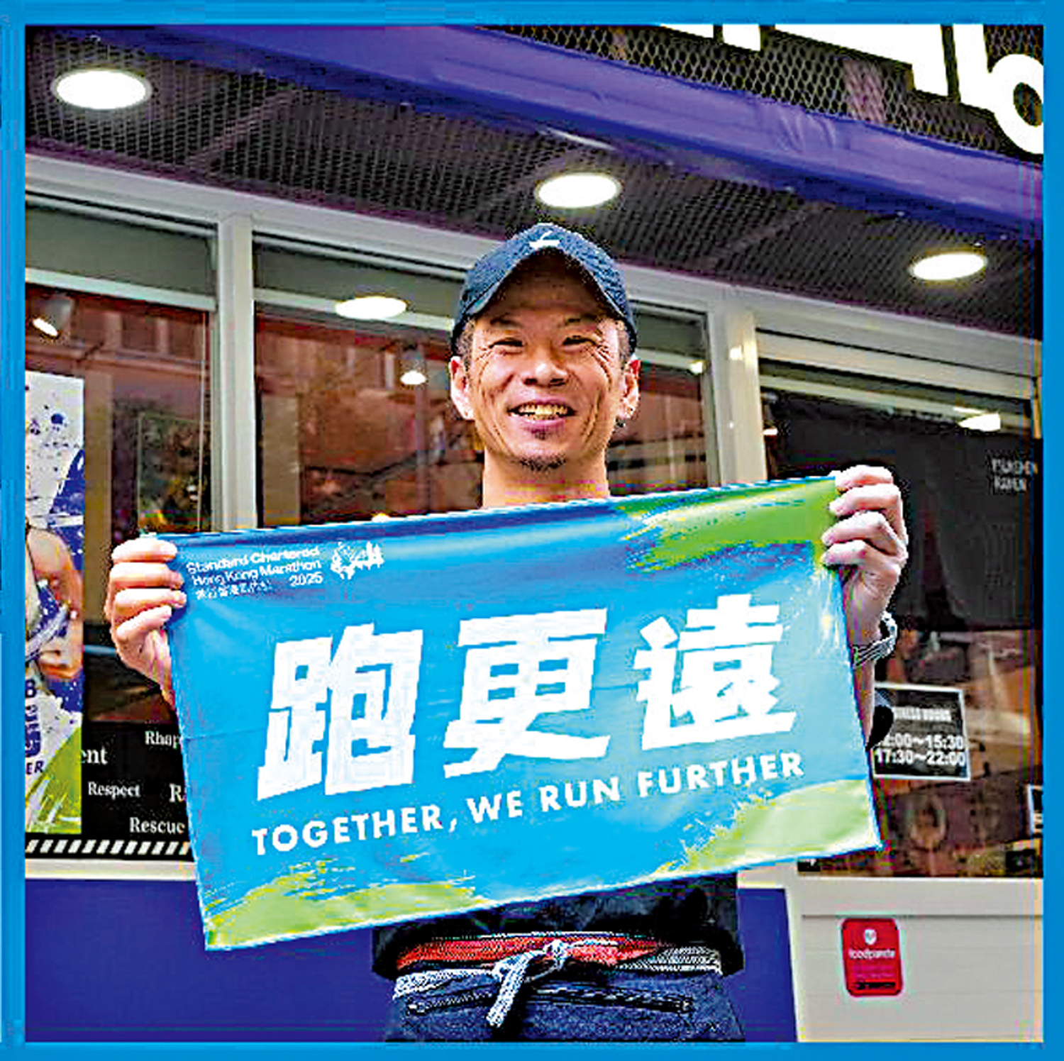 為鼓勵全城一齊參與渣馬這場盛事,大會今年特地準備了「跑更遠」的應援頭巾(圖),給大家在賽事當天為跑手打氣。由今天開始,每間參與「助小店撐跑手」計劃的打氣小店,都準備了限量應援頭巾送給打氣觀眾,同時希望提升賽道的嘉年華氣氛。
