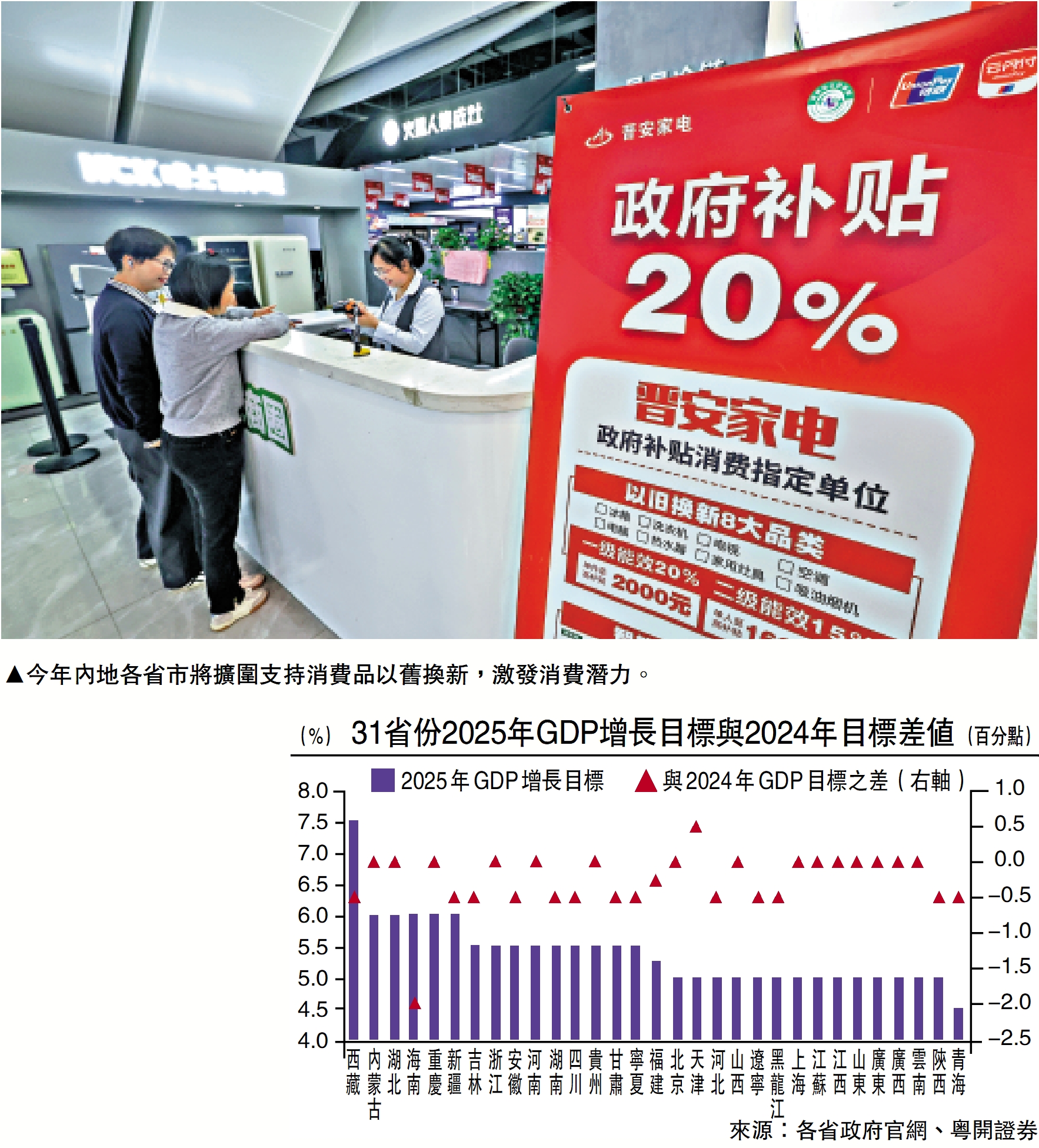 今年31省份GDP平均增長目標5.3%,當中,29個省份將GDP增長目標設定在5%至6%之間,預計全國2025年經濟增長目標或將設定為5%左右。西藏GDP目標最高,要求GDP增長7%以上,力爭達到8%。當前各地既面臨外需不確定、國內有效需求不足的問題,也有前期增量政策逐步顯效的有利形勢,地方制定的今年經濟增長目標小幅調整,但總體基調依然積極進取。分省份看,僅天津上調了GDP增長目標,15個省份下調經濟增長目標,15個省份目標基本持平。西藏、新疆目標全國領先,源自「一帶一路」沿線貿易持續驅動和產業轉移加快,既拓展了國際貿易,又擴大國內省際產業投資合作,將能源資源優勢轉化為發展新動能。
