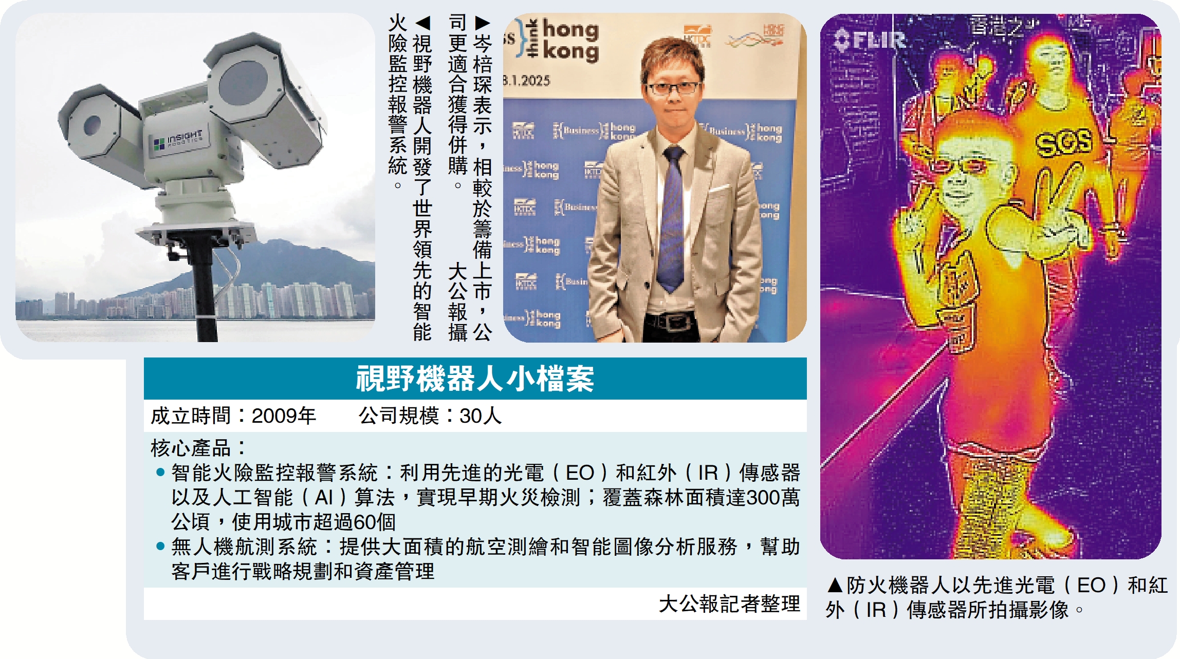 當中,視野機器人(Insight Robotics)公司研發的智能火險監控報警系統,可透過實時監測與早期火情識別,降低森林火災蔓延的風險。公司聯合創辦人及首席執行官岑棓琛表示,本港初創企業可利用粵港合作優勢進行核心技術測試,亦可利用香港平台拓展國際業務。\大公報記者 李樂兒