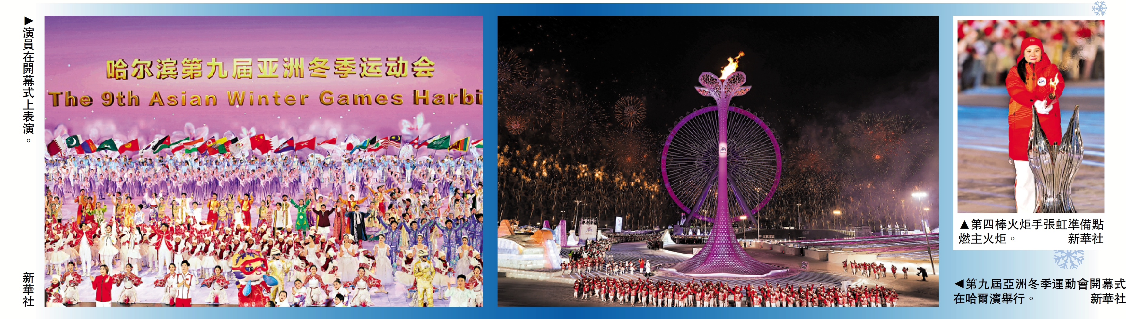 文藝表演拉開帷幕,表演分為上中下三部分。上篇《熾熱冰雪》,採冰漢子手握冰鑹、踏冰起舞,「頭冰」破江而出,點亮本屆會徽「超越」,芭蕾舞者翩然舞動於冰天雪地之中。中篇《燃情時速》中,亞冬健兒在光影紗幕上飛掠而過,人群嬉戲共舞,憨態可掬的「大雪人」亮相場中。下篇《山高水長》中,舞者以熱情舞姿展現生動圖景,獨具特色的「陽台音樂會」從舞台延伸到觀眾席。21時24分,大熒幕現場聯動冰雪大世界分會場,楊揚、韓曉鵬、王鎮、張虹等4名火炬手接力傳遞。手提冰燈的孩子們與火炬手攜手前行,共同點燃主火炬塔。全場合唱主題歌《點亮亞洲》。