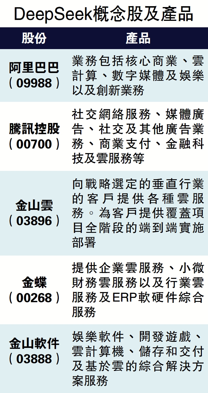 同時DeepSeek開源模型低成本技術的創新,有望加速應用側的繁榮,雲計算算力需求將進一步上升,該行建議關注中國相關雲計算公司,包括阿里巴巴(09988)、騰訊控股(00700)、金山雲(03896)等。