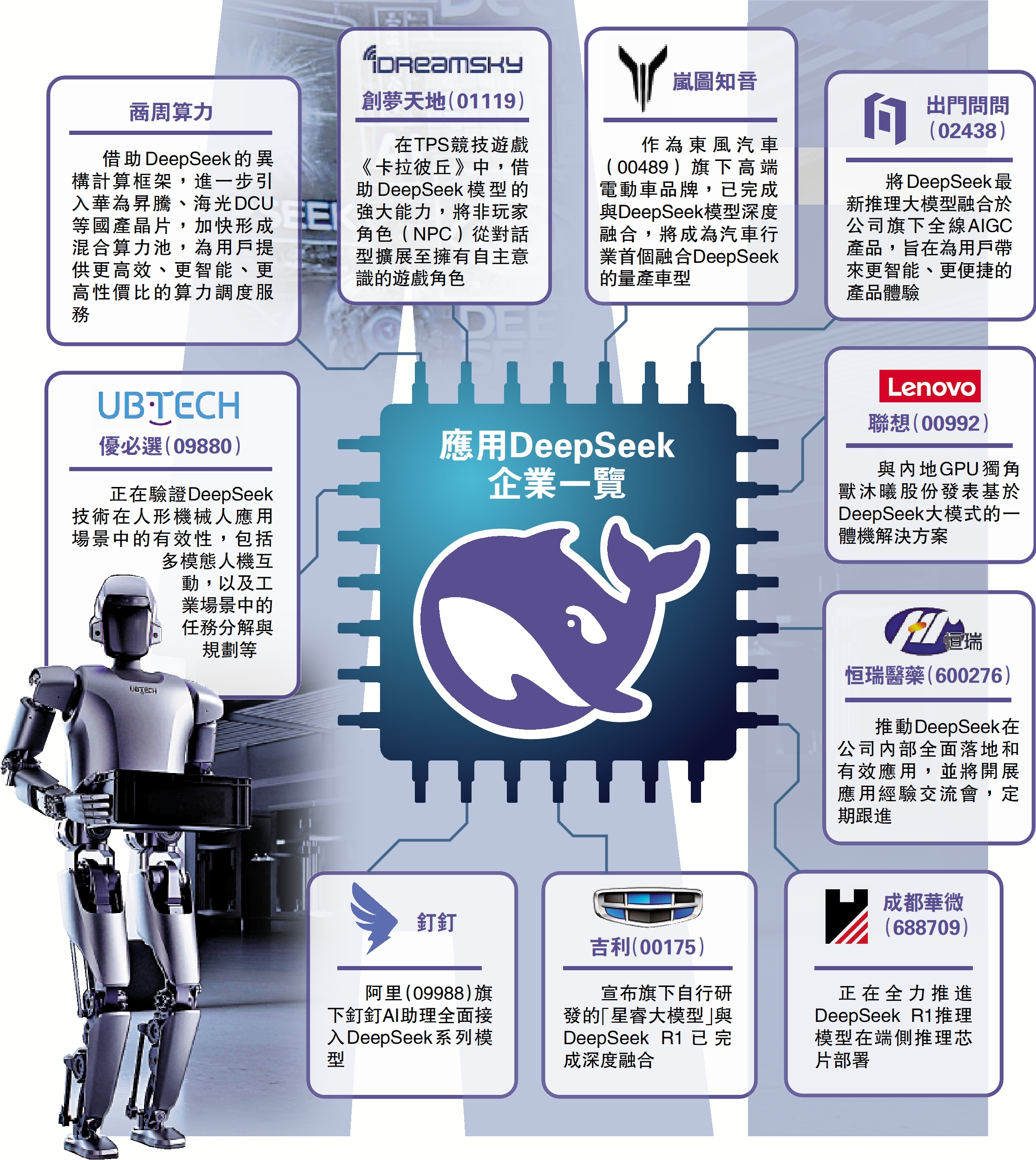 中國人工智能(AI)新創企業深度求索推出的AI大模型DeepSeek,以低成本高效益引起全球關注,多間企業紛紛擁抱新技術,令自身業務提速增效(見附表)。除優必選(09880)正在人形機器人應用場景中驗證DeepSeek技術的有效性外,手遊股創夢天地(01119)更稱完成DeepSeek部署,落地遊戲與社區等多場景。中國醫藥股「一哥」恒瑞醫藥亦確定,推動DeepSeek在內地內部全面落地。\大公報記者 許 臨