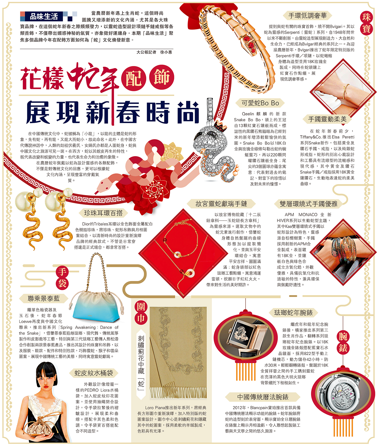 當農曆新年遇上生肖蛇,這個時尚圖騰又增添新的文化內涵。尤其是各大珠寶品牌,在這個蛇年新春之際頻頻發力,以靈蛇造型設計項鏈手鏈戒指等各類首飾,不僅帶出媚惑神秘的氣質,亦象徵好運纏身。本期「品味生活」聚焦多個品牌今年在配飾方面如何為「蛇」文化煥發新意。\大公報記者 徐小惠
