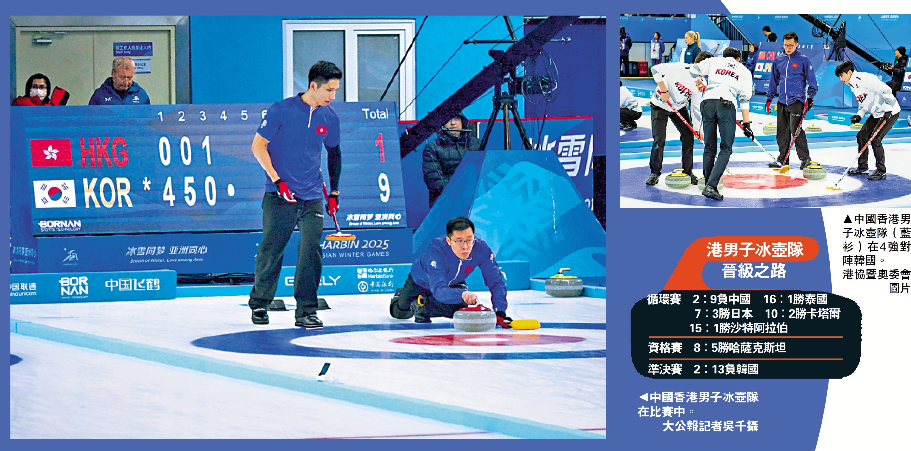 13日晚,哈爾濱亞冬會舉行兩場男子冰壺準決賽,於資格賽擊敗哈薩克斯坦而晉級的中國香港隊在力戰下,最終以2:13不敵韓國隊。港隊將於今早9時對陣國家隊,爭奪銅牌。如果港隊能夠取勝,便可為中國香港體育代表團歷史性首摘亞冬會獎牌。(港台電視32今早8時55分直播賽事)\大公報記者 吳千哈爾濱報道