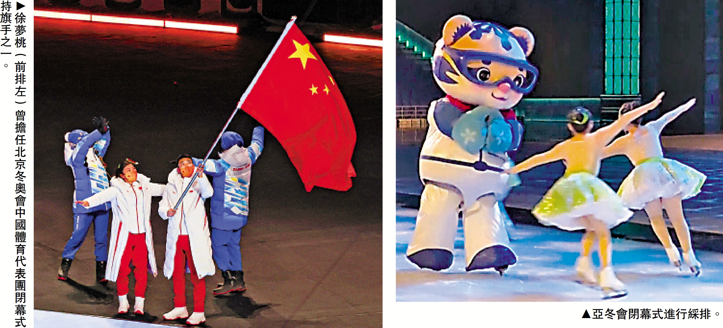 另據記者于海江哈爾濱報道,中國自由式滑雪運動員徐夢桃將擔任閉幕式中國體育代表團旗手。徐夢桃在本屆亞冬會收穫2金1銀,她表示,從體育精神到體育文化,再到技術與經驗的傳承,自己和前輩們一樣,肩負着將這份寶貴財富傳遞給下一代的重任。她認為,空中技巧項目之所以能取得今天的輝煌成就,離不開上幾代前輩們爬冰卧雪、頑強拚搏、勇攀高峰、永不言棄、為國爭光的體育精神。這種精神是空中技巧項目的靈魂,也是這一代運動員繼續傳承和發揚光大的寶貴財富。
