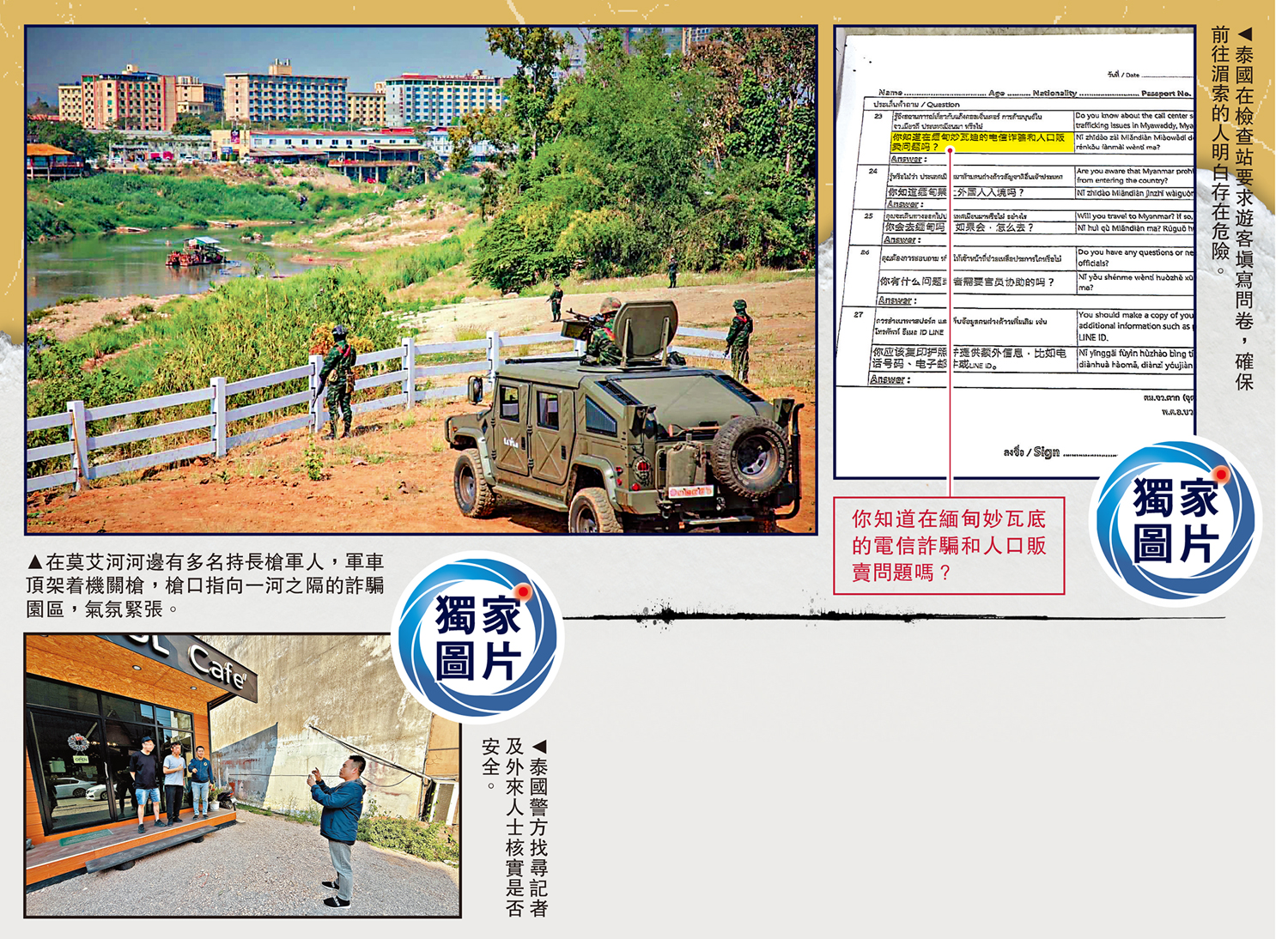 之後,再為各人進行人車拍照存檔。記者每日多次收到當地警察來電,詢問身在何方及是否安全。在踏入湄索的次日,記者電話更收到本港入境處的短訊,指該處協助在外香港居民小組從泰國有關當局得悉閣下正身處泰國邊界地方,小組有一重要事項要跟你聯繫,請盡快致電我們的24小時熱線(852)1868或使用「入境處流動應用程式」以網絡數據致電1868熱線。短訊接着又詢問是否需要入境處協助,非常貼心,足見香港特區政府非常關心在泰緬邊境的港人安危。\大公報調查組泰緬邊境報道