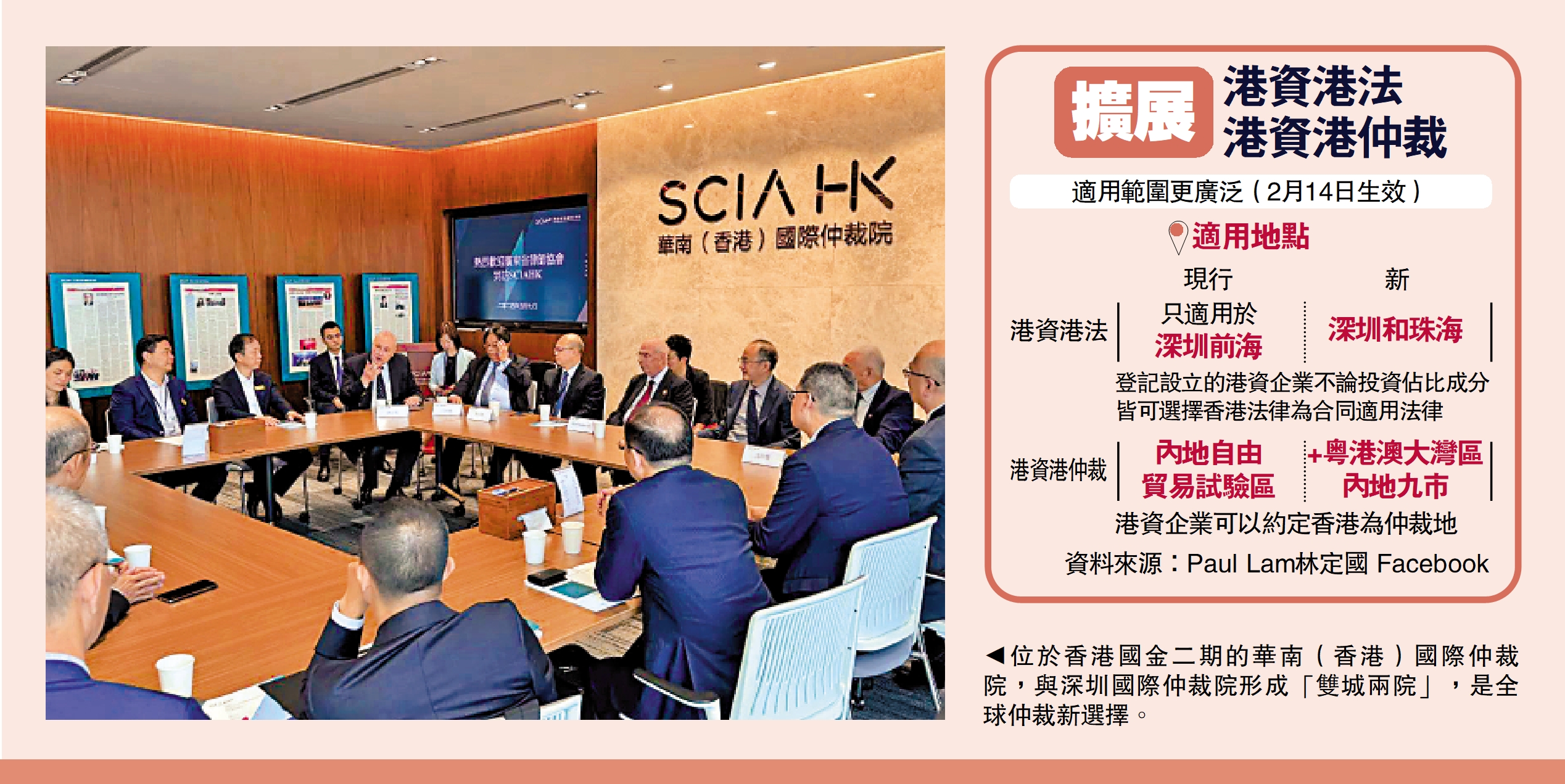 就進一步擴大「港資港法」、「港資港仲裁」適用範圍,最高人民法院及司法部14日聯合發布意見,圍繞仲裁服務大灣區高質量發展,推出七項新舉措。《意見》明確「港(澳)資港(澳)仲裁」制度,港資澳資企業可選擇內地或港澳作為仲裁地解決商事糾紛,新措施2月14日生效。同時,加快推進大灣區國際一流仲裁機構建設,將廣州、深圳國際商事仲裁中心建設試點與香港、澳門國際法律及爭議解決服務中心建設緊密結合,規劃建設大灣區國際商事仲裁中心。
