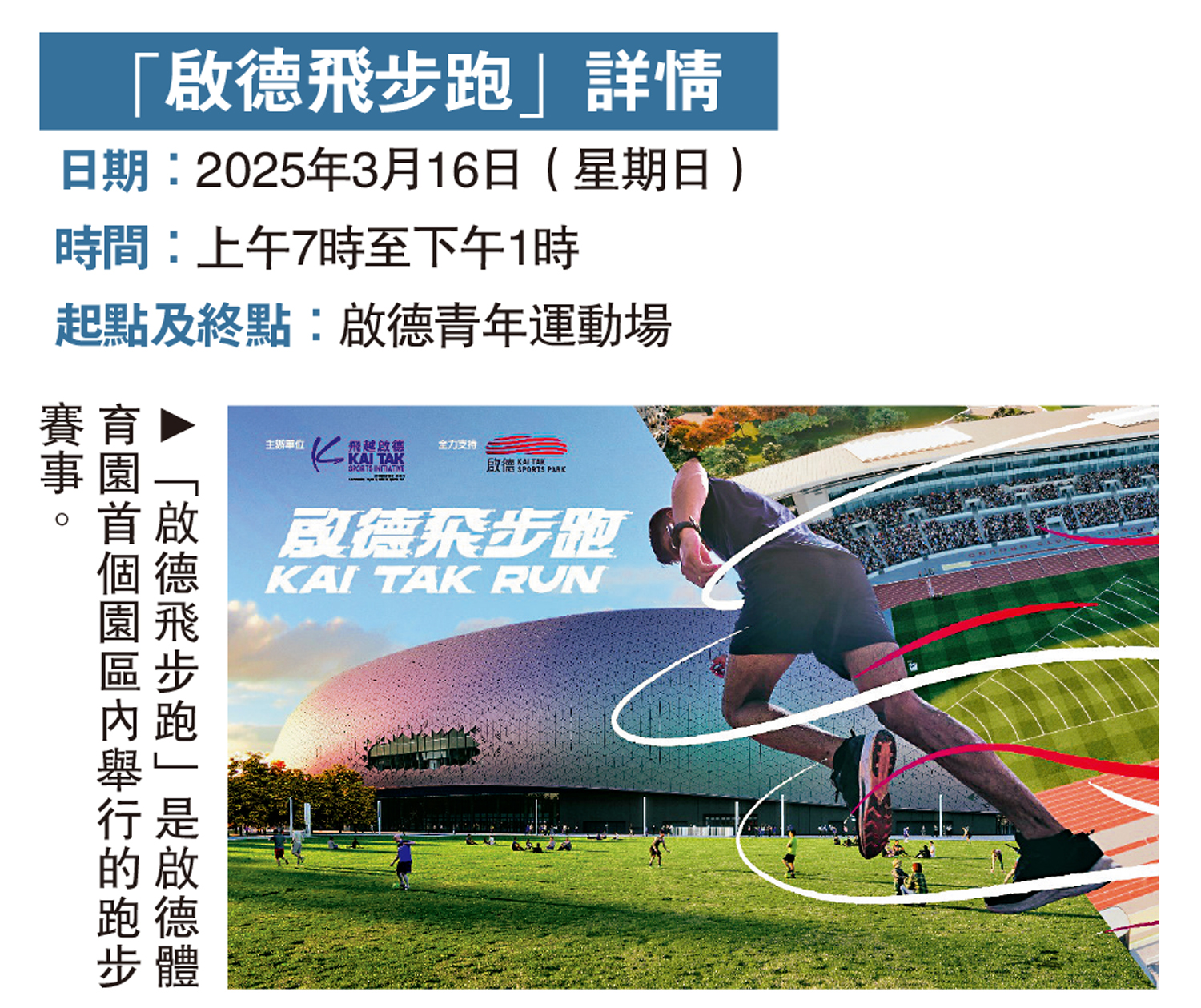 【大公報訊】由飛越啟德主辦、啟德體育園協辦的「啟德飛步跑」,將於3月16日盛大舉行。作為啟德體育園首個園區內舉行的跑步賽事,大會精心設計了一條獨特路線,務求讓跑手們在比賽過程中,可飽覽園區內景觀及設施外,更可同時享受運動樂趣!