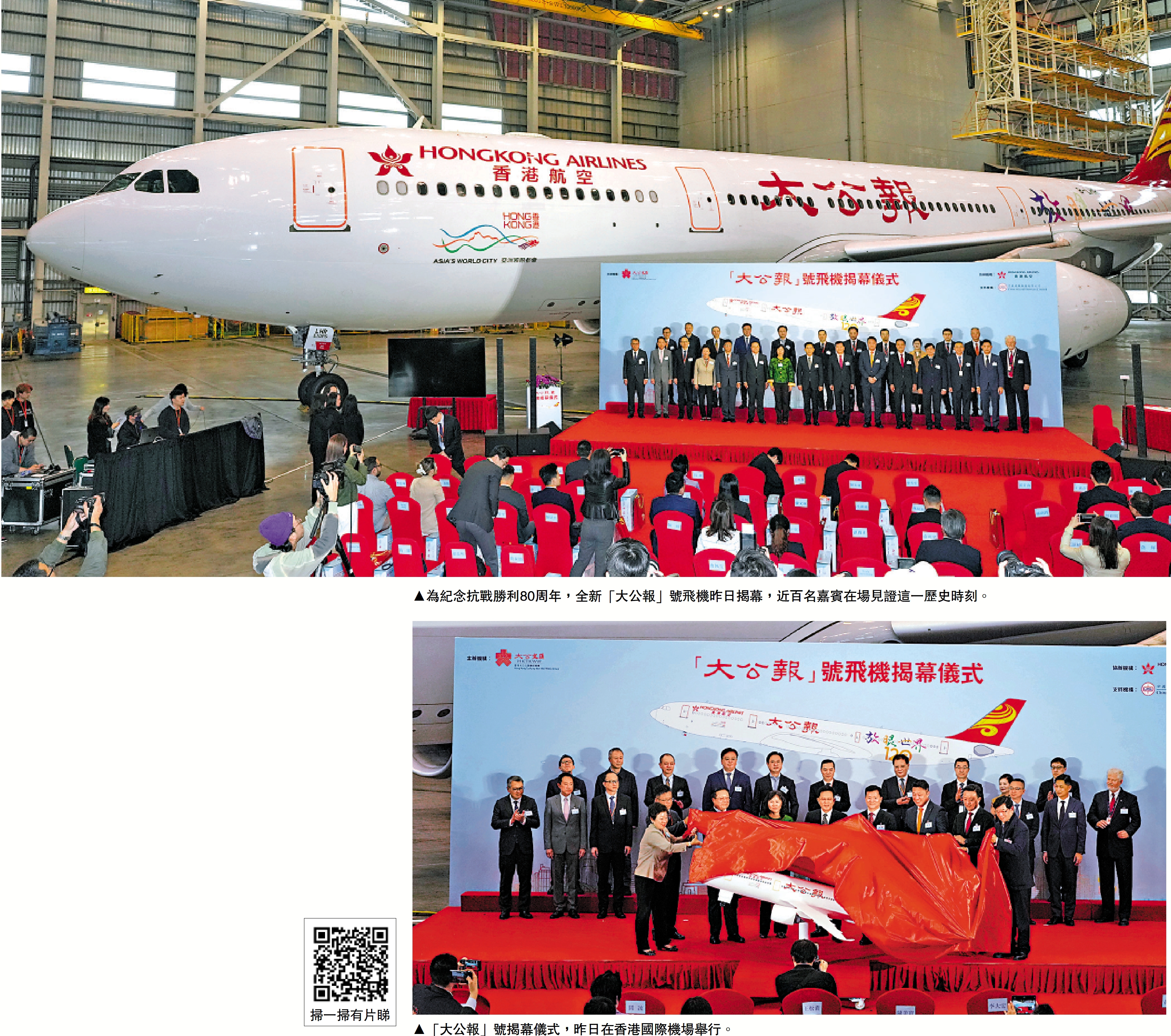 2月14日,由《大公報》與香港航空聯手打造的「大公報」號飛機,揭幕儀式在香港國際機場隆重舉行,為香港今年紀念抗戰勝利80周年系列活動揭開序幕。在新時代的今天,「大公報」號飛機再上雲霄,傳承愛國精神,將在國際舞台上更好講述中國故事。