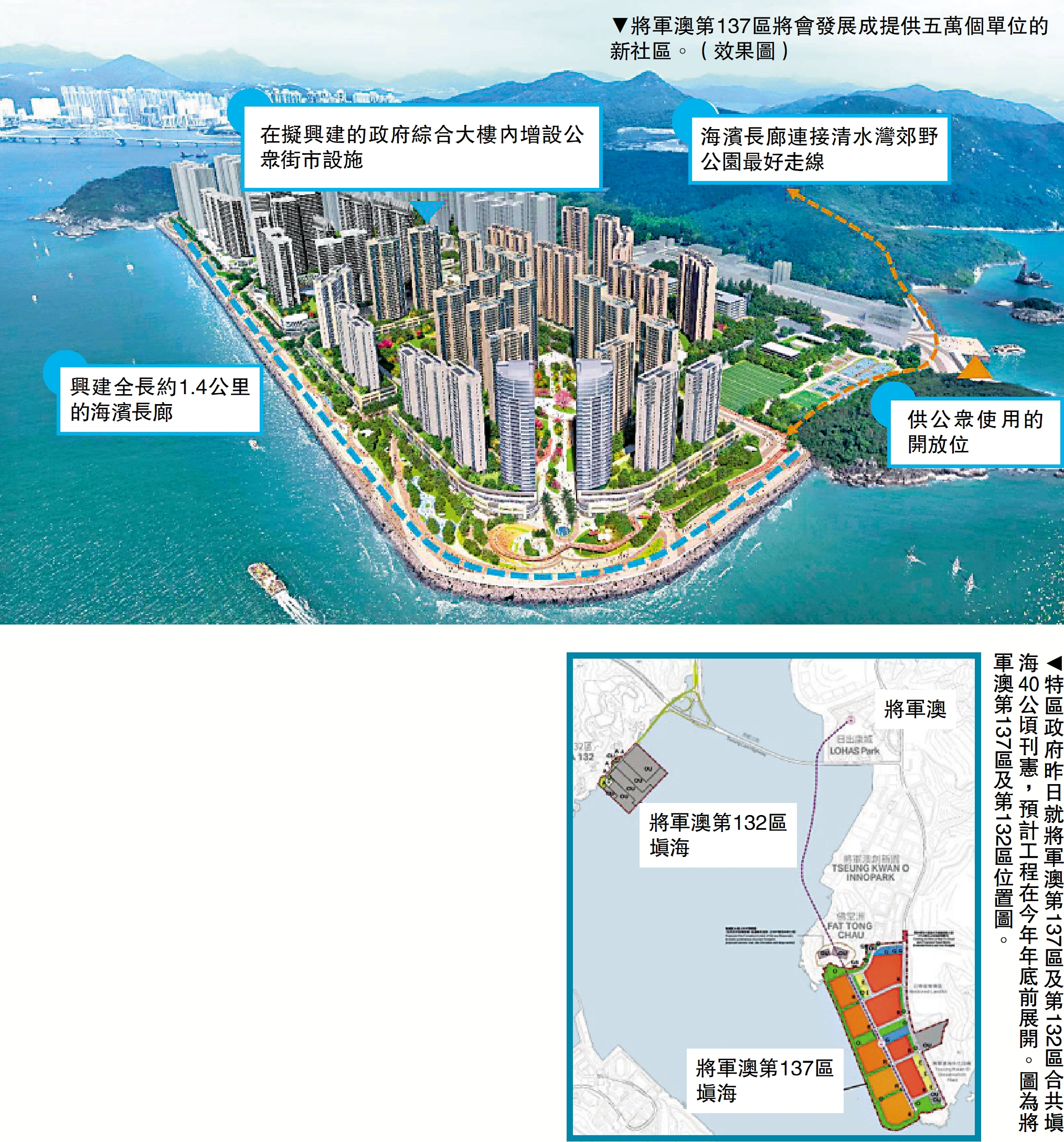 將軍澳日出康城以南的將軍澳第137區填海發展計劃即將展開,政府昨日就將軍澳第137區及第132區合共填海40公頃刊憲,預計工程在今年年底前展開,其中將軍澳第137區將會發展成提供五萬個單位的新社區。