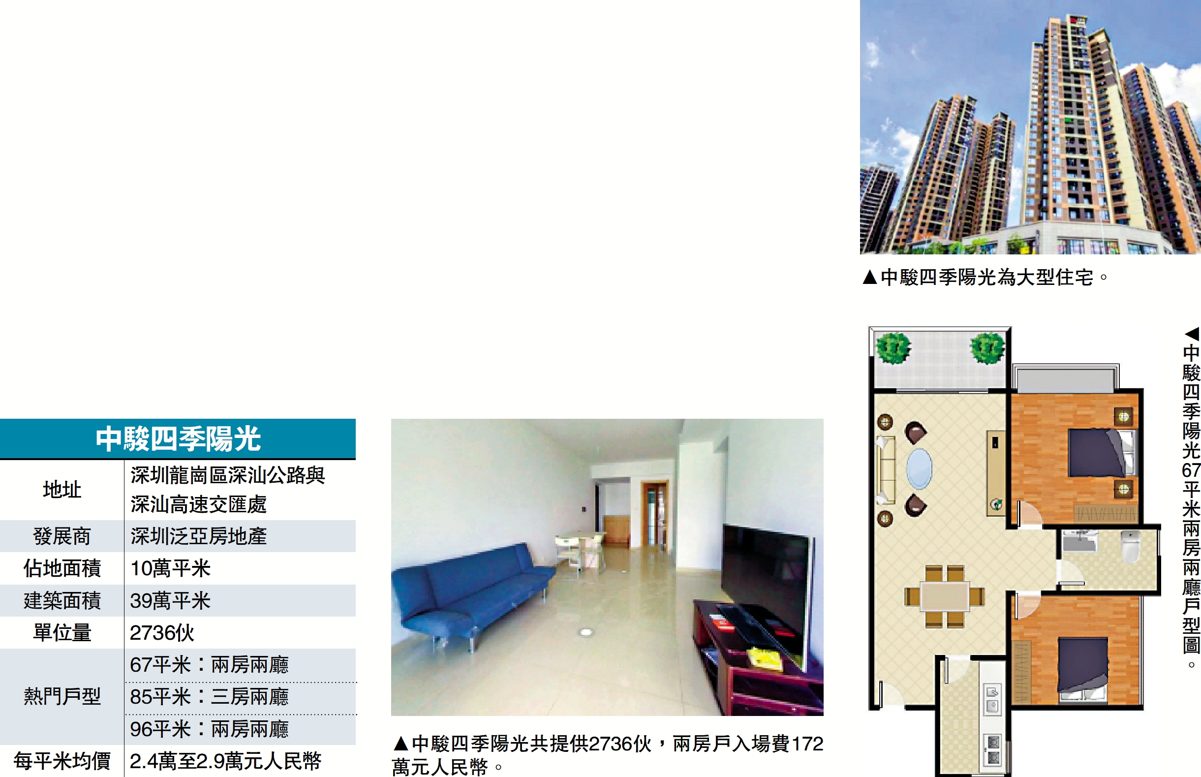 中駿四季陽光為大型住宅,佔地10萬平米,建築面積39萬平米,分三期發展,共21幢物業,合共2736伙。第一期住宅樓高24至38層,單位面積主要由65至105平米,每平米均價2.4萬至2.9萬元(人民幣,下同)(約2.6萬至3.1萬港元),一個67平米兩房戶入場費172萬元。 項目設有綠化帶、休閒廣場和兒童遊樂設施,周邊有龍城公園、龍潭公園等,適合住戶休閒活動。