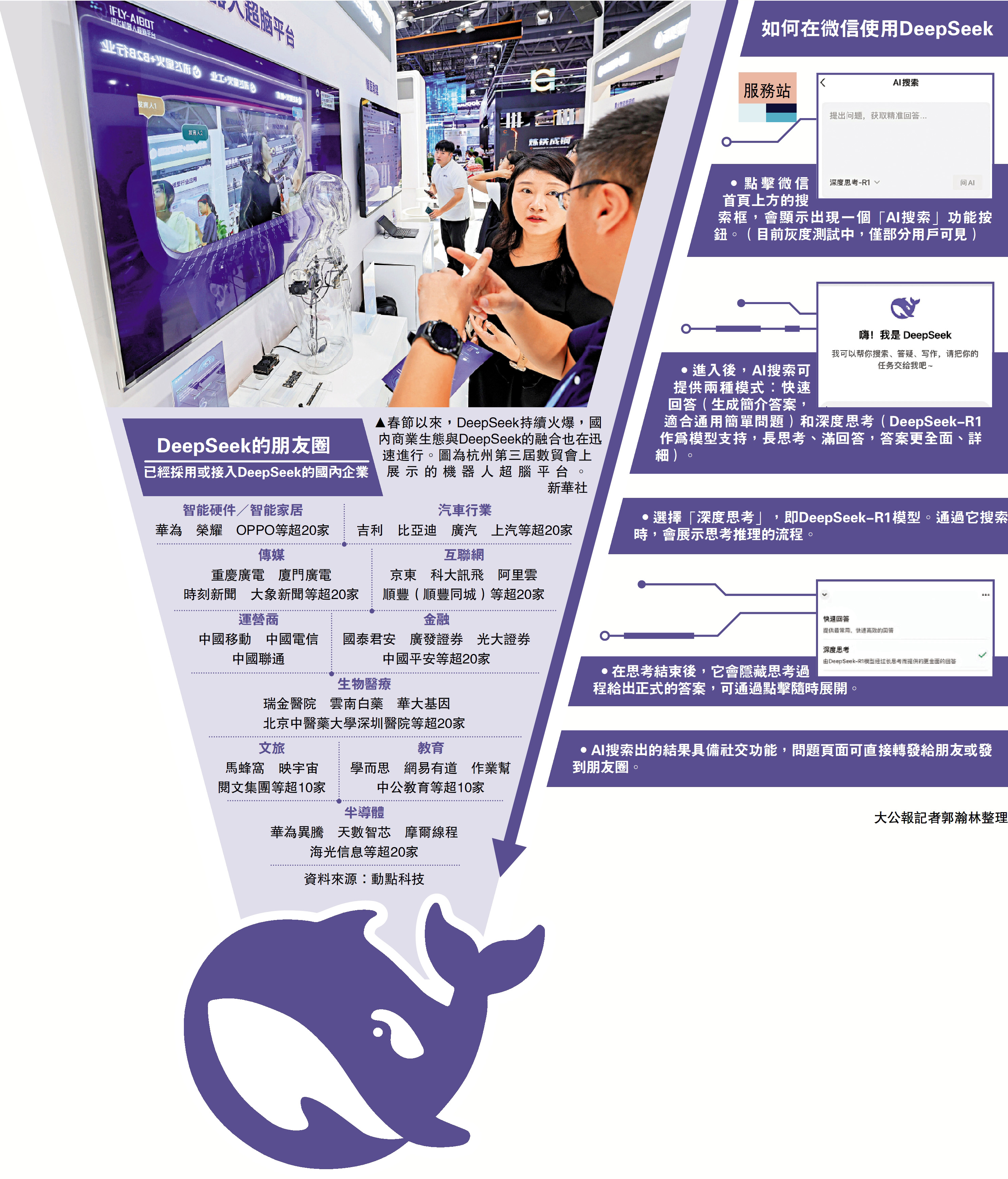 16日,擁有超13億月活的「超級應用」微信也官宣灰度測試接入DeepSeek-R1模型,DeepSeek朋友圈不斷擴大,為AI技術的普惠發展再度注入強勁動力。\大公報記者 郭瀚林北京報道