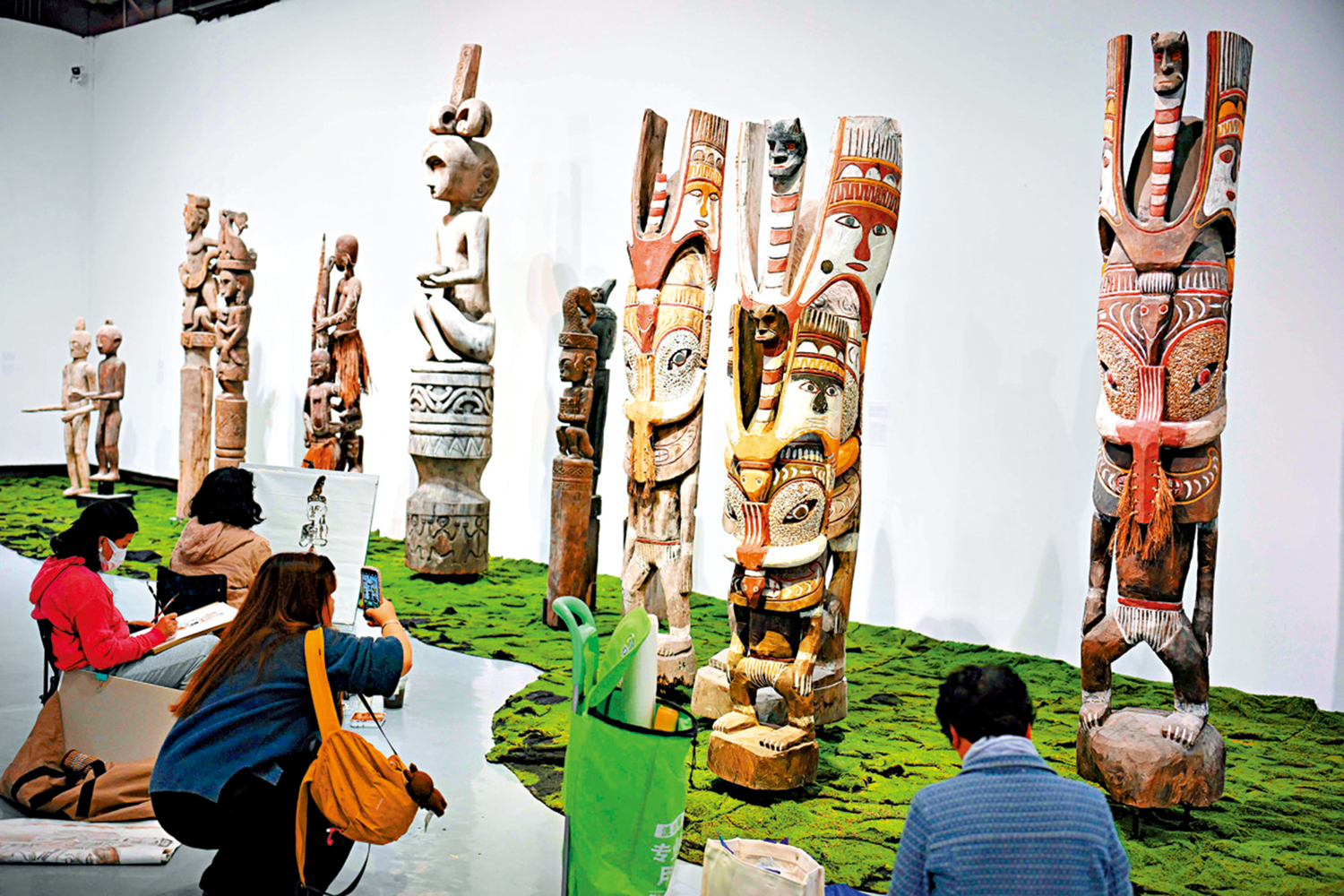 圖:深圳華僑城文化創意園南區展館正在舉行「雨林之歌」藝術收藏展,通過三百餘件木雕作品及田野影像,呈現熱帶雨林的文化與生態智慧,探索其與現代生活的關聯。\香港中通社