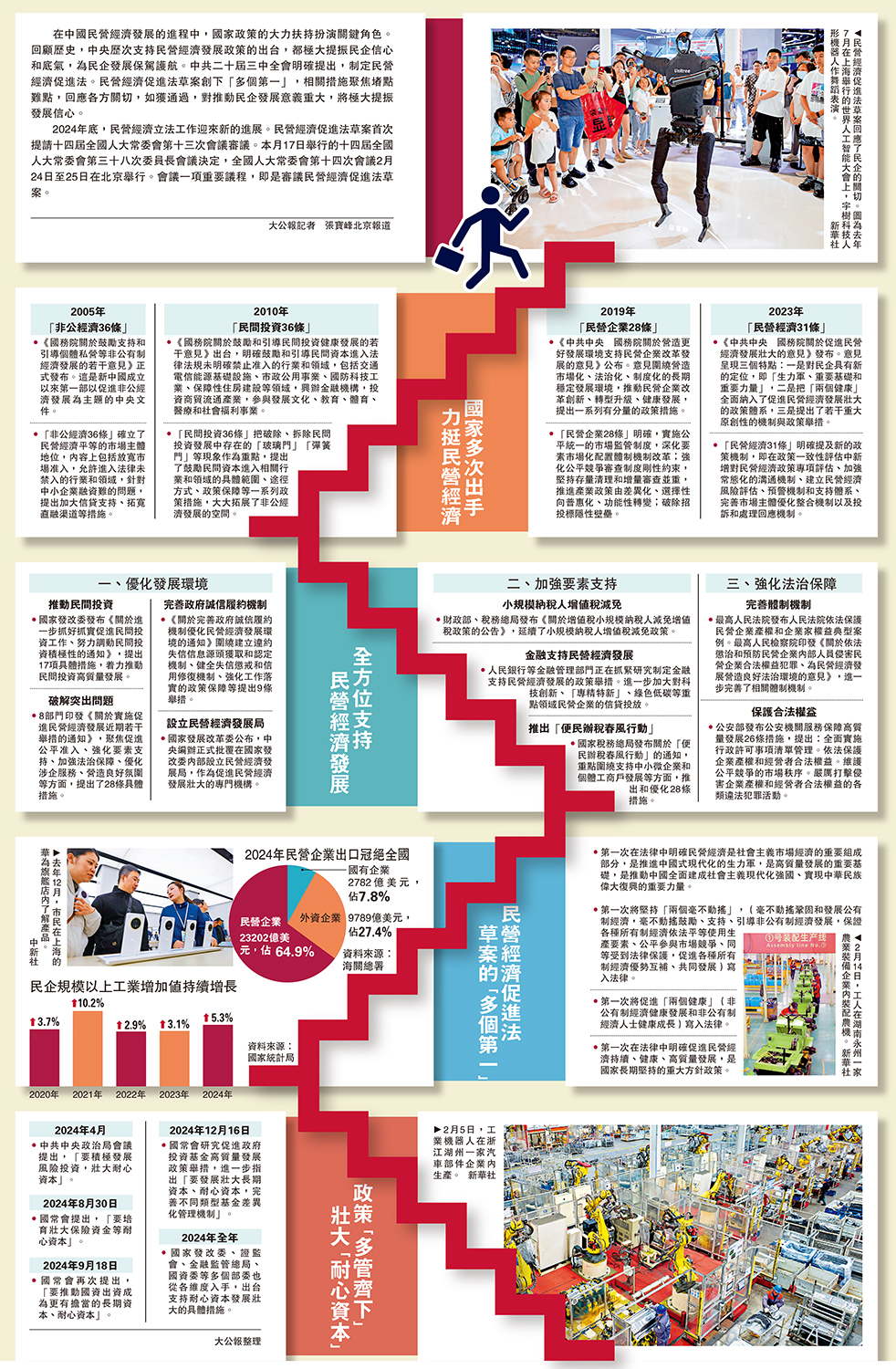 在中國民營經濟發展的進程中,國家政策的大力扶持扮演關鍵角色。回顧歷史,中央歷次支持民營經濟發展政策的出台,都極大提振民企信心和底氣,為民企發展保駕護航。中共二十屆三中全會明確提出,制定民營經濟促進法。民營經濟促進法草案創下「多個第一」,相關措施聚焦堵點難點,回應各方關切,如獲通過,對推動民企發展意義重大,將極大提振發展信心。