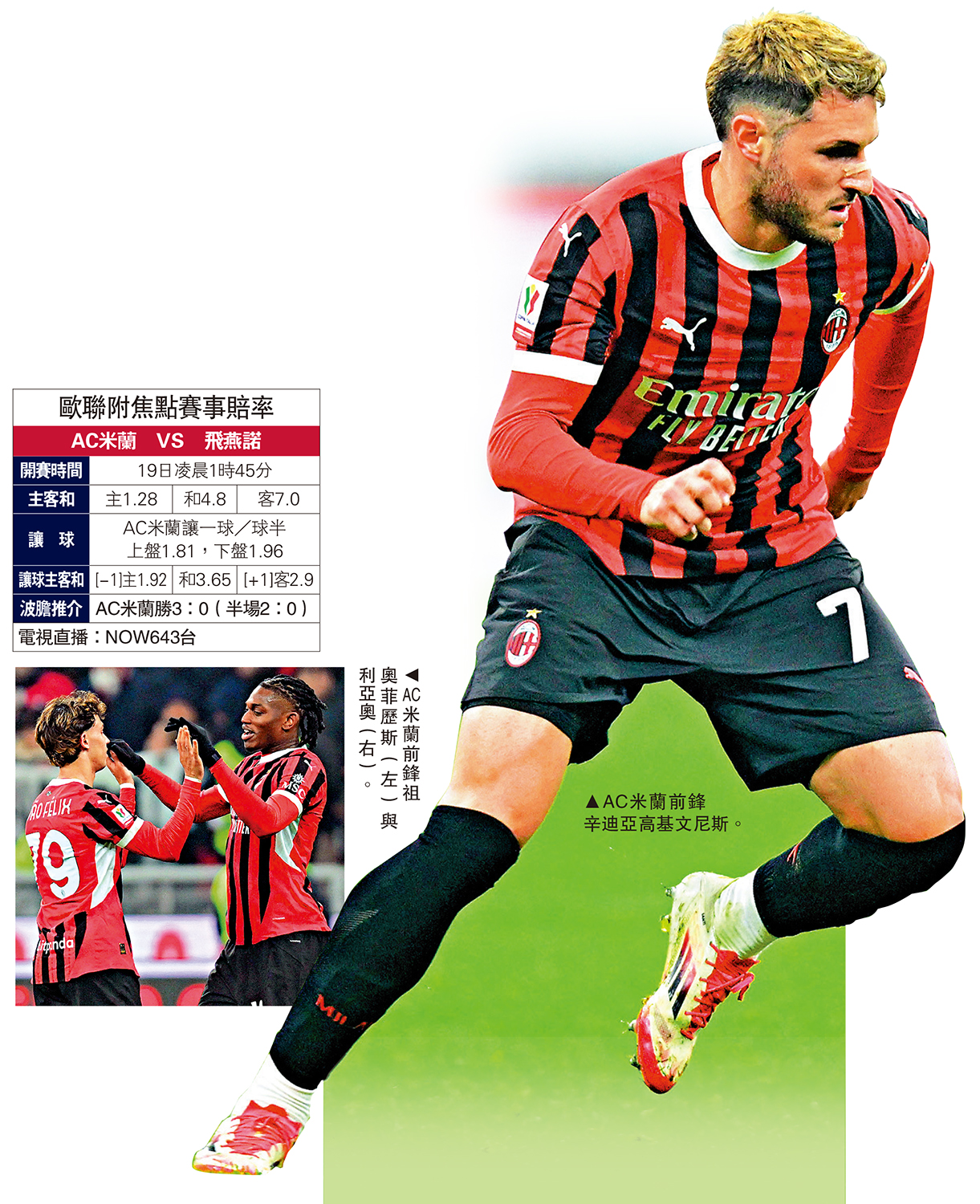 飛燕諾在首回合前突然炒掉原主帥,但在青年軍教頭保斯查特帶領下,依然憑翼鋒派沙奧的入球而領先,惟上場荷甲續強陣之下作客就只能與中游的NAC互交白卷;事實上該隊傷兵滿營下亦難作輪換,上仗還不幸又多了前鋒上田綺世和中場昆頓添巴兩主將受傷,恐難保領先優勢,買「讓球主客和」AC米蘭[-1]的讓主可保本增值。(NOW643台明晨1時45分直播)