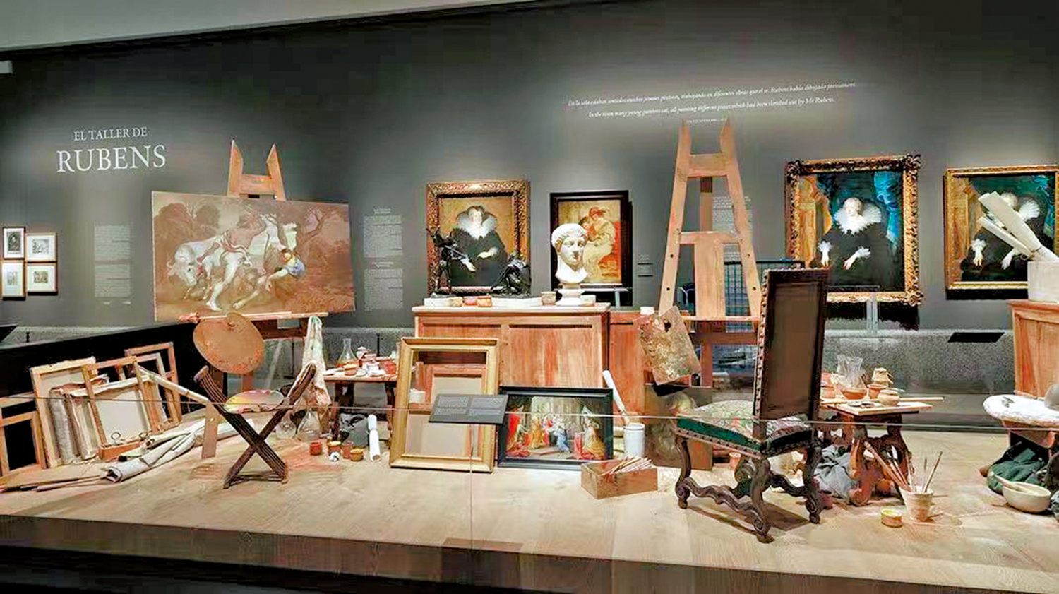 邁進空氣中瀰漫着淡淡松節油味道的「魯本斯工坊」展廳,迎面看到的便是正中央試圖還原魯本斯工坊狀態的裝置陳列。畫筆、調色盤、畫架畫布、堆積如山的用來於盛放顏料的牡蠣殼和扇貝殼、散落的草圖和未完成的畫稿,以及和魯本斯自畫像同款的寬邊黑帽及披風都集中擺在展廳中央,構成了還原魯本斯工坊的展區。顯然,這個區域相比較當年其故居的盛況算是小巫見大巫了。一六二一年,丹麥皇家醫生奧托·斯佩靈(Otto Sperling)在參觀了魯本斯工坊後曾記述:「我們拜訪了最著名的畫家魯本斯,他在創作時有專人為他朗誦羅馬歷史學家塔西佗(Tacitus)的著作。他並未因為我們的到來而中斷其工作,仍舊口授了一封信,同時回答所有來訪者的問題,之後安排所有人在其僕人的帶領下參觀他的豪宅及古董收藏……這裏聚集了很多年輕的畫家,每個人都在各自忙着完成魯本斯先生用粉筆勾勒並略加顏料點綴的不同作品。這些年輕人要將這些畫作上色並完成,直到最後由魯本斯先生潤色加以完善……所有這些都被稱為是魯本斯的作品。」從他的口中,我們能夠直觀了解到彷彿有分身術般的魯本斯是如何高效地創作,且同時兼顧統籌其成熟的「創作流水線」。