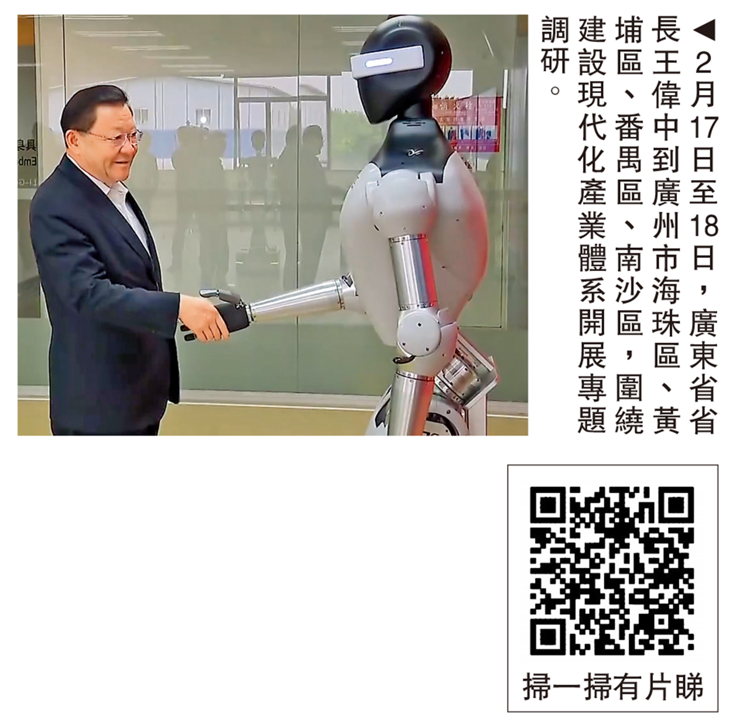 【大公報訊】據南方+報道:2月17日至18日,廣東省省長王偉中到廣州市海珠區、黃埔區、番禺區、南沙區,深入科技創新企業、新型研發機構一線,圍繞建設現代化產業體系開展專題調研。